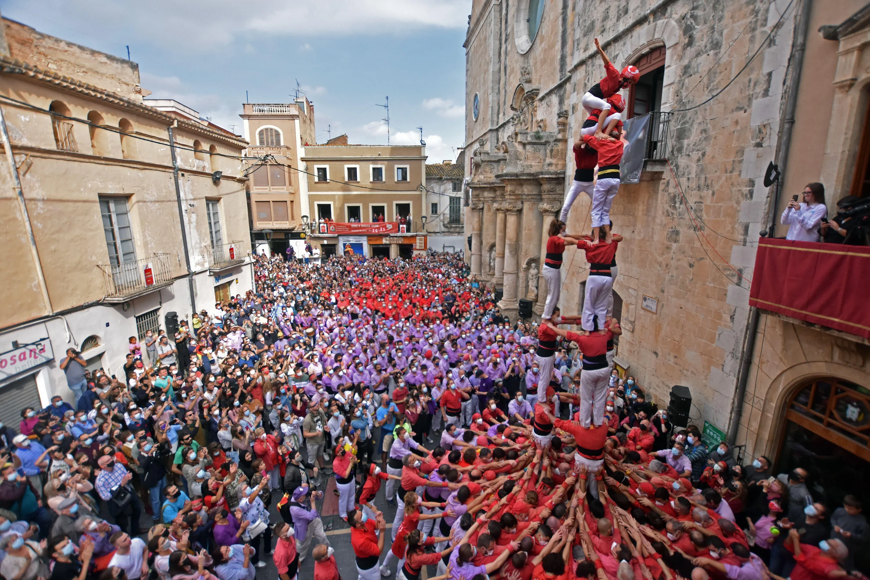 The Castellers of the Nens del Vendrell group raise a castle of human towers during the Santa Teresa Festival in Vendrell, Spain on October 17, 2021. The Castellers are groups of people who by tradition in some towns and cities in Catalonia and since the 18th century have built and dismantled human towers simulating a castle of human towers of different sizes and heights. These human towers are traditionally built during festivals of the cities and towns of Catalonia. (Photo by Ramon Costa/SOPA Images/Rex Features/Shutterstock)