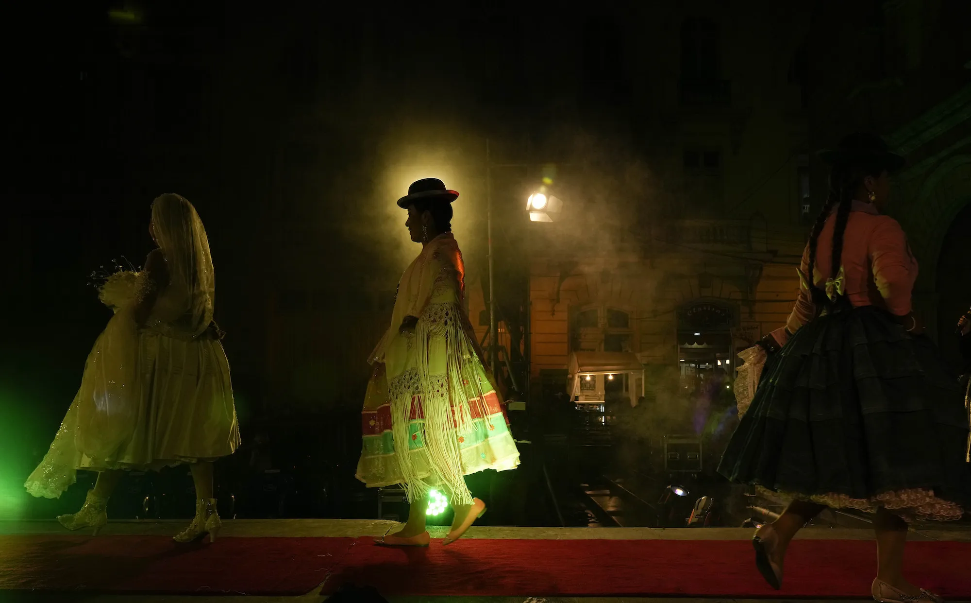 Aymara women models a creation by a local designer at a Chola fashion in La Paz, Bolivia, Thursday, October 14, 2021. The fashion show is designed to promote the Andean style and beauty of Aymara women, who are commonly called Cholitas in Bolivian slang. (Photo by Juan Karita/AP Photo)