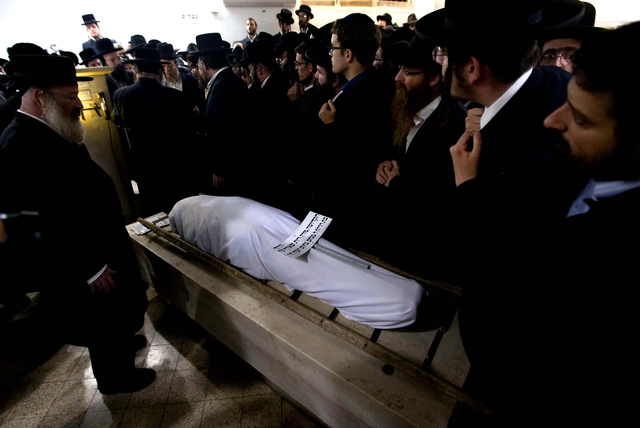 Ultra Orthodox Jewish men gather around the body of Mirah Sharf, who was killed in the southern town of Kiryat Malachi by a rocket fired by Palestinian militants from the Gaza Strip, during her funeral in Jerusalem. Gaza militants led by the ruling Hamas Islamic group showered Israel with more than 150 rockets in an unprecedented assault Thursday, killing three Israelis and trying for the first time to strike Tel Aviv, the densely populated heart of the Jewish state. (Photo by Sebastian Scheiner/Associated Press)