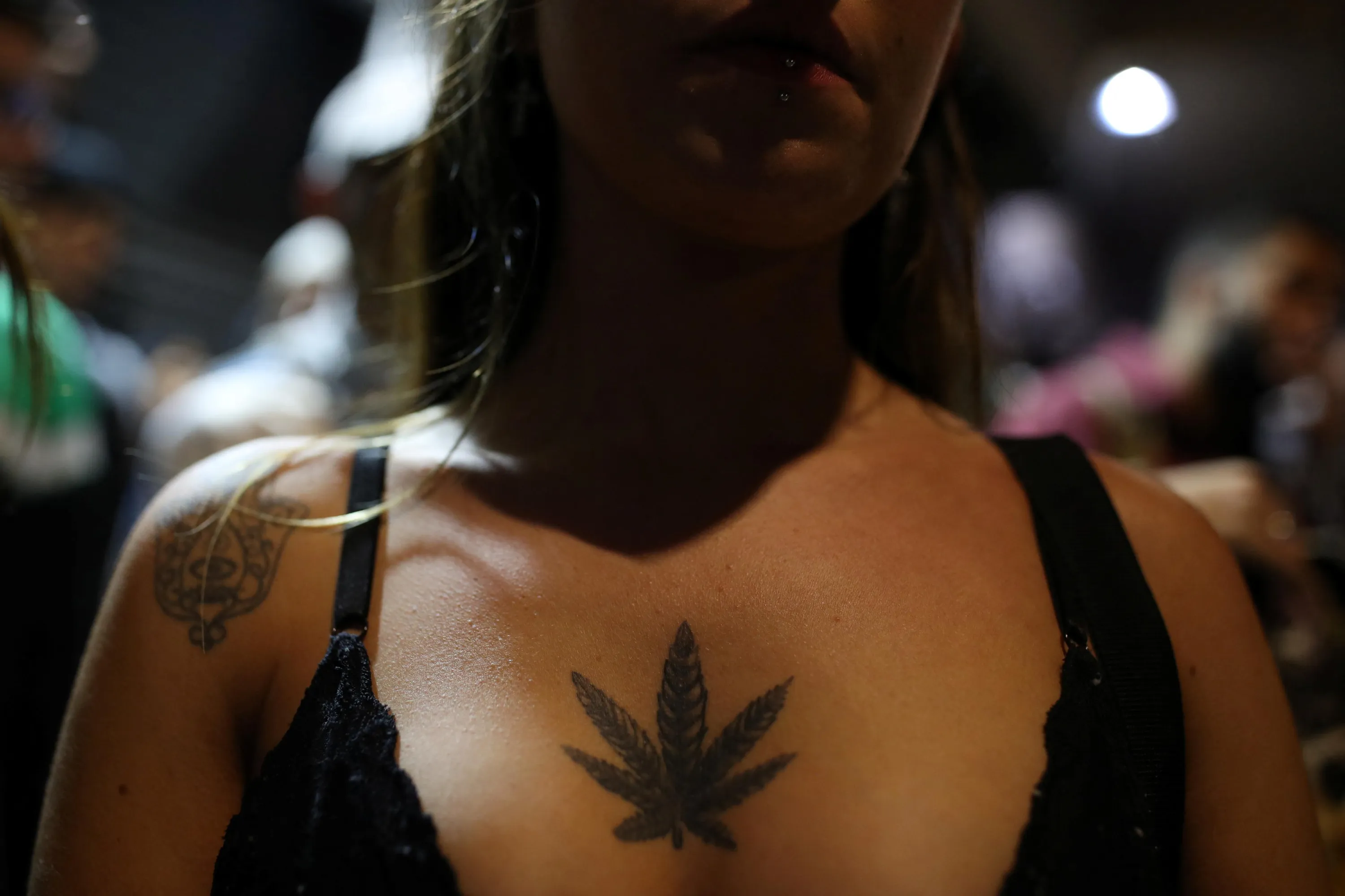 A woman with the cannabis leaf tattooed on her chest takes part in the march for marijuana, in favor of the decriminalization of cannabis, in Sao Paulo, Brazil on June 11, 2022. (Photo by Amanda Perobelli/Reuters)