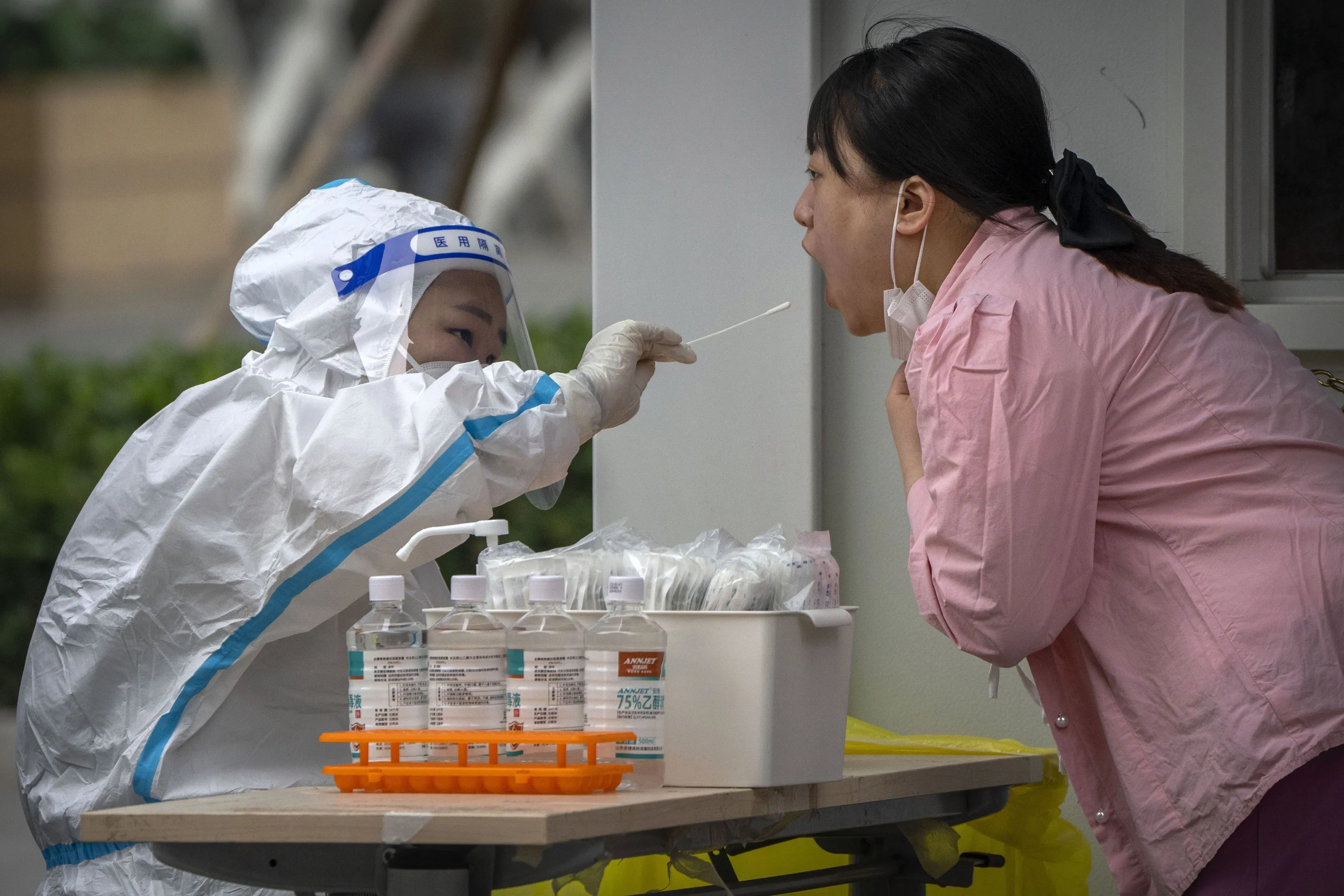 A worker wearing a protective suit swabs a woman's throat for a COVID-19 test at a coronavirus testing site in Beijing, Thursday, June 9, 2022. (Photo by Mark Schiefelbein/AP Photo)