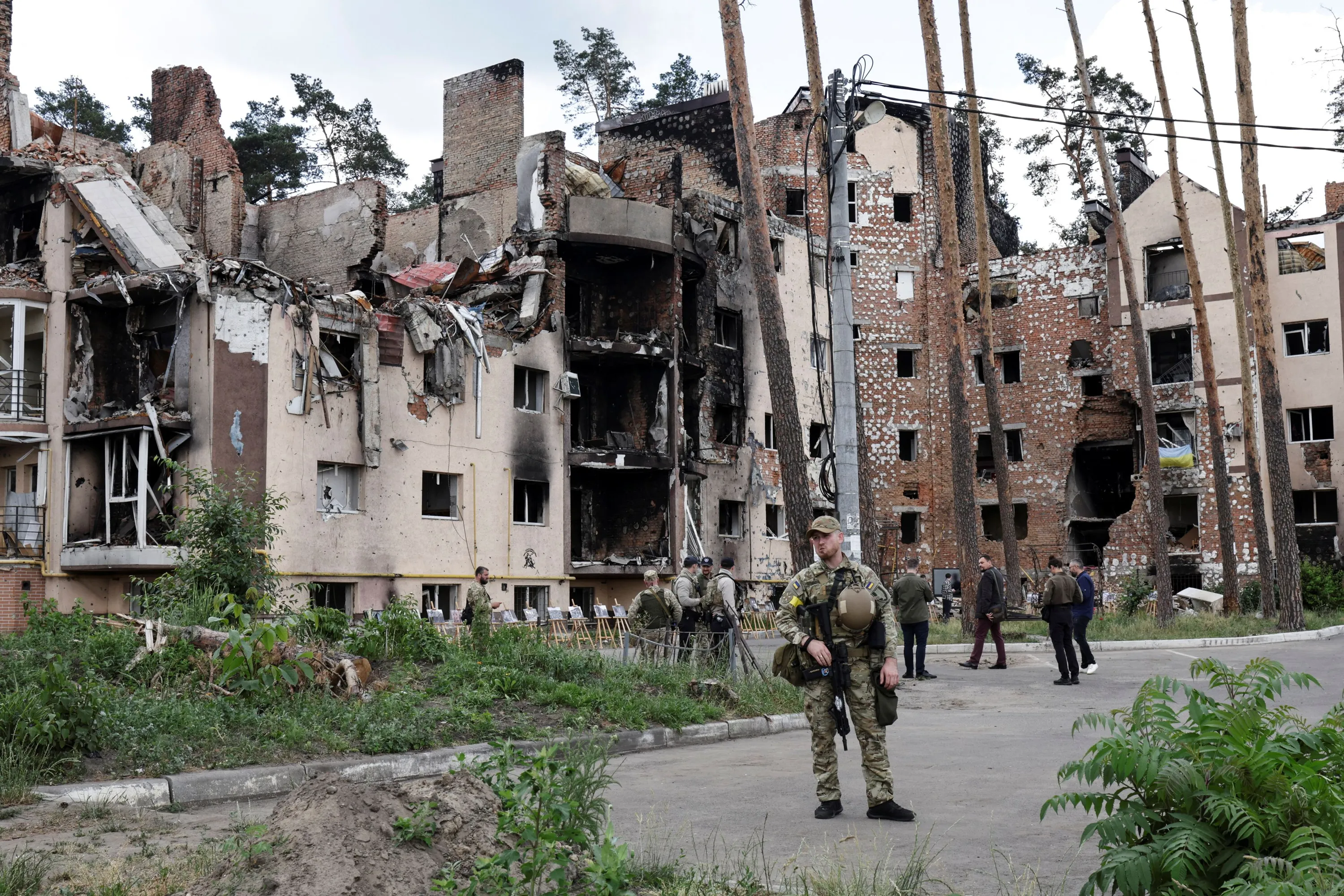 A Ukrainian serviceman stands guard ahead of the arrival of French President Emmanuel Macron, German Chancellor Olaf Scholz, and Italian Prime Minister Mario Draghi, as Russia's attack on Ukraine continues, in Irpin near Kyiv, Ukraine June 16, 2022. (Photo by Marko Djurica/Reuters)