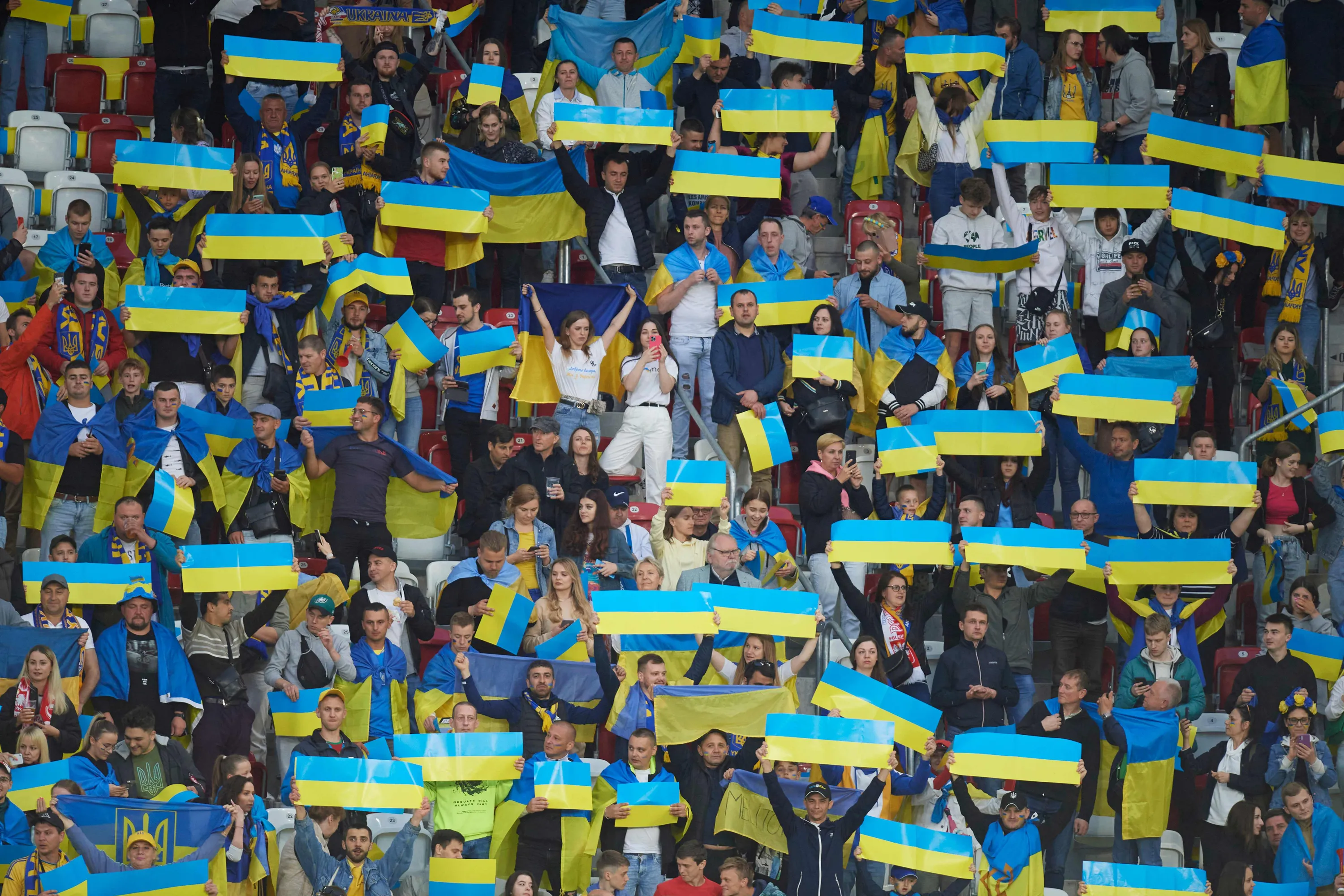 Fans of Ukraine display flags during the UEFA Nations League football match Ukraine v Republic of Ireland in Lodz, Poland on June 14, 2022. (Photo by Radoslaw Jozwiak/AFP Photo)