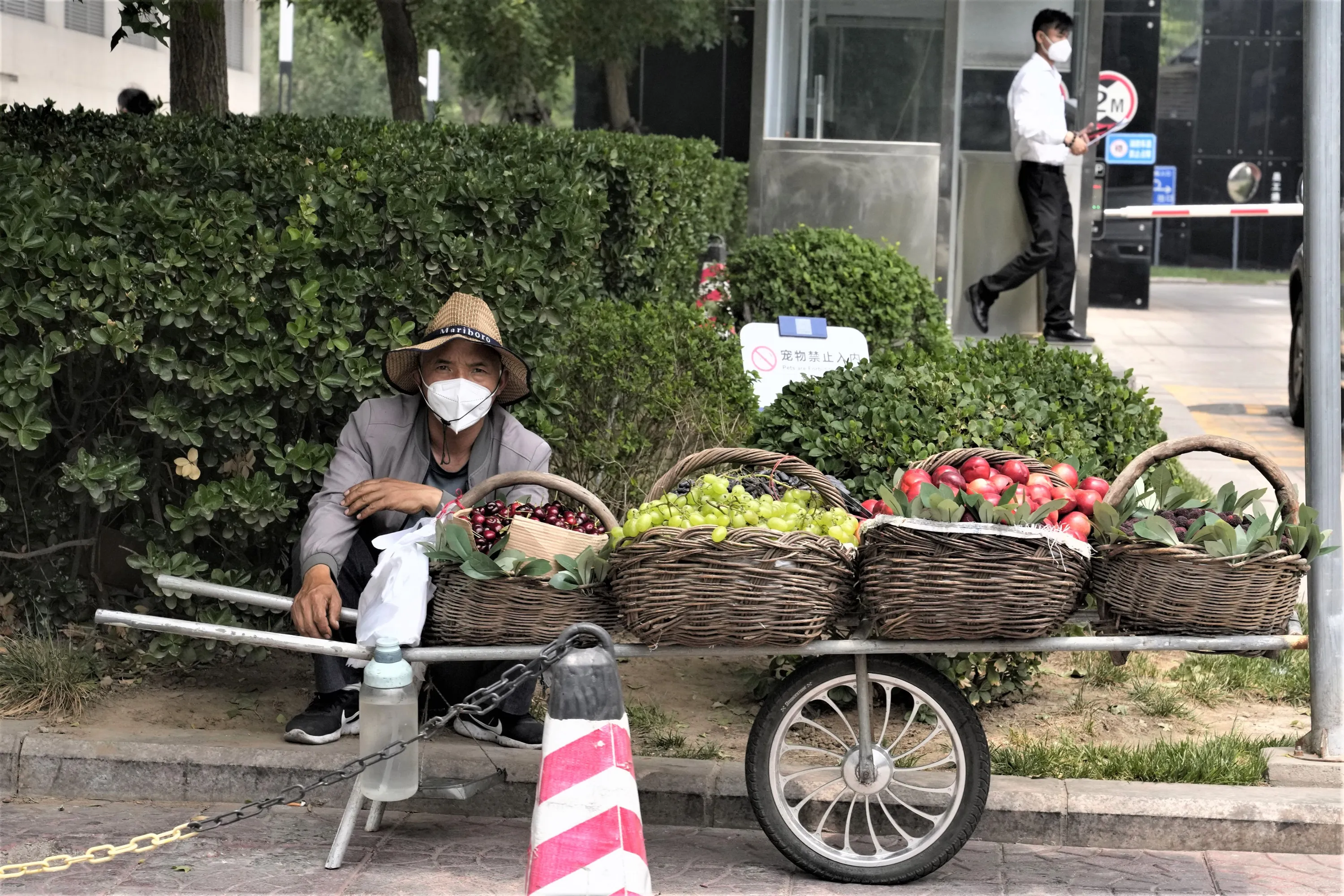 A street vendor selling fruit wears a mask as he waits for customers, Friday, June 17, 2022, in Beijing. (Photo by Ng Han Guan/AP Photo)