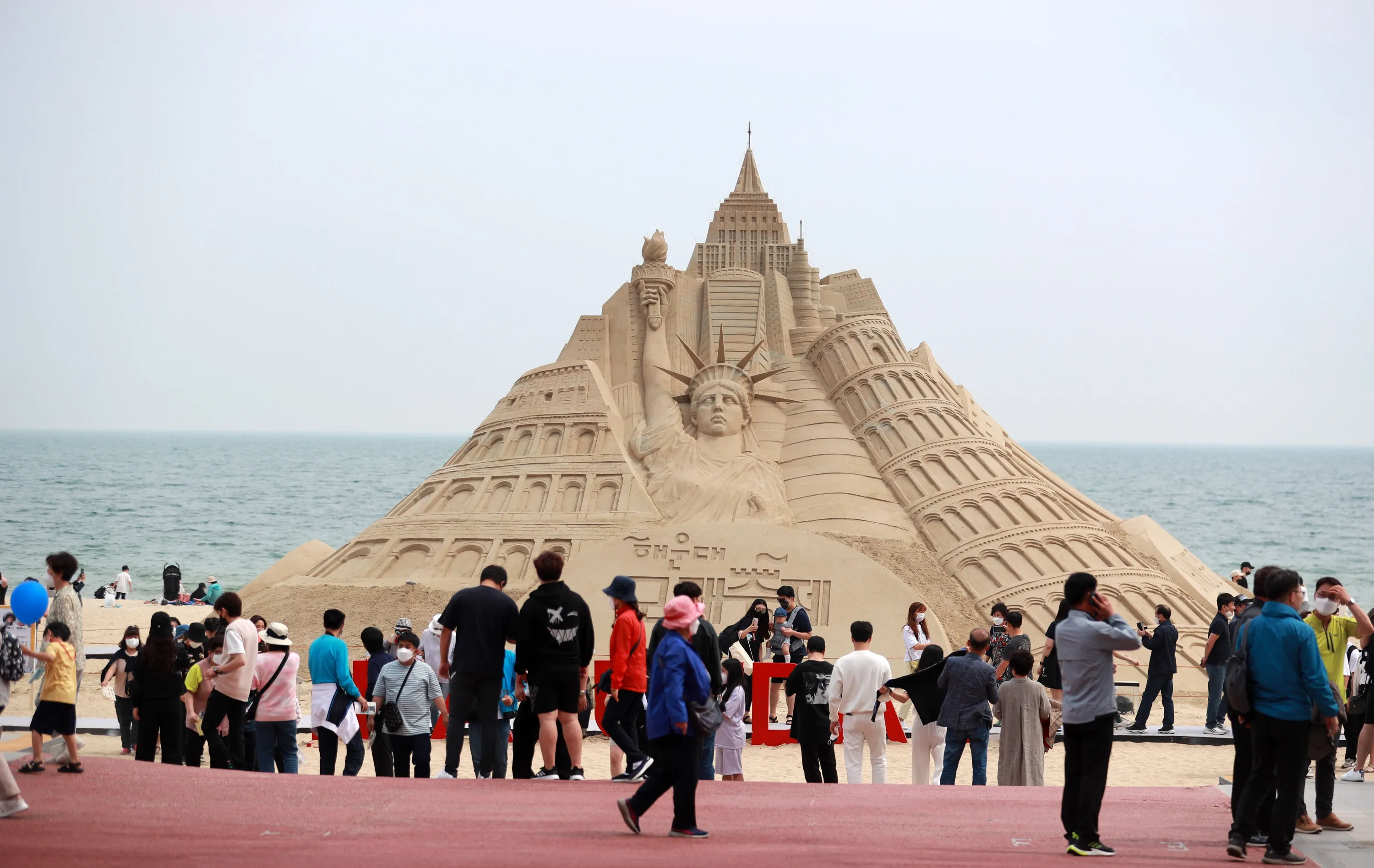 The annual sand festival, featuring sand sculptures, opens at Haeundae Beach in Busan, South Korea, 20 May 2022. (Photo by Yonhap/EPA/EFE)