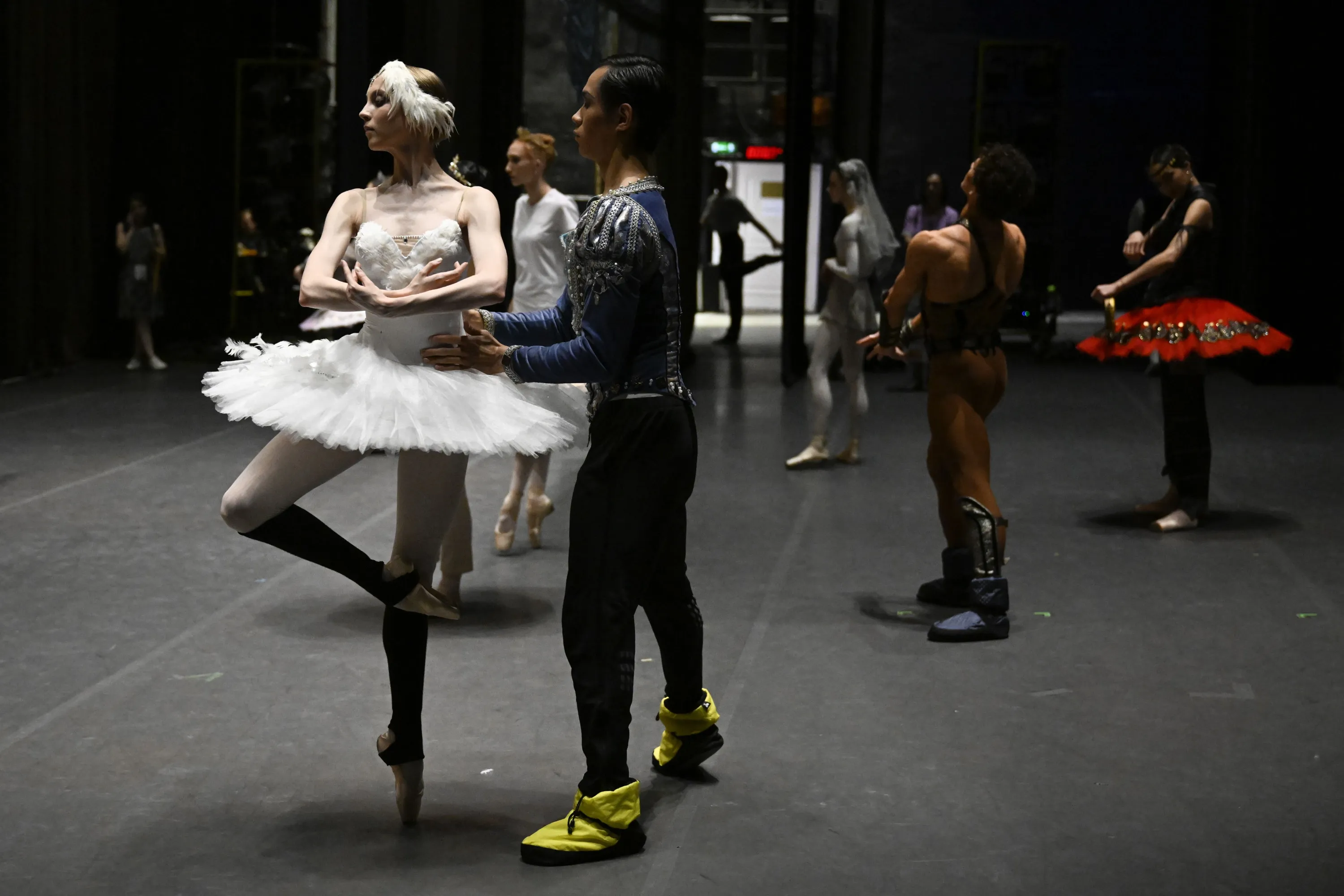 Participants in the 14th International Ballet Competition warm up backstage before going out on the New Stage of the Bolshoi Theater in Moscow, Russia, June 11, 2022. (Photo by AP Photo/Stringer)