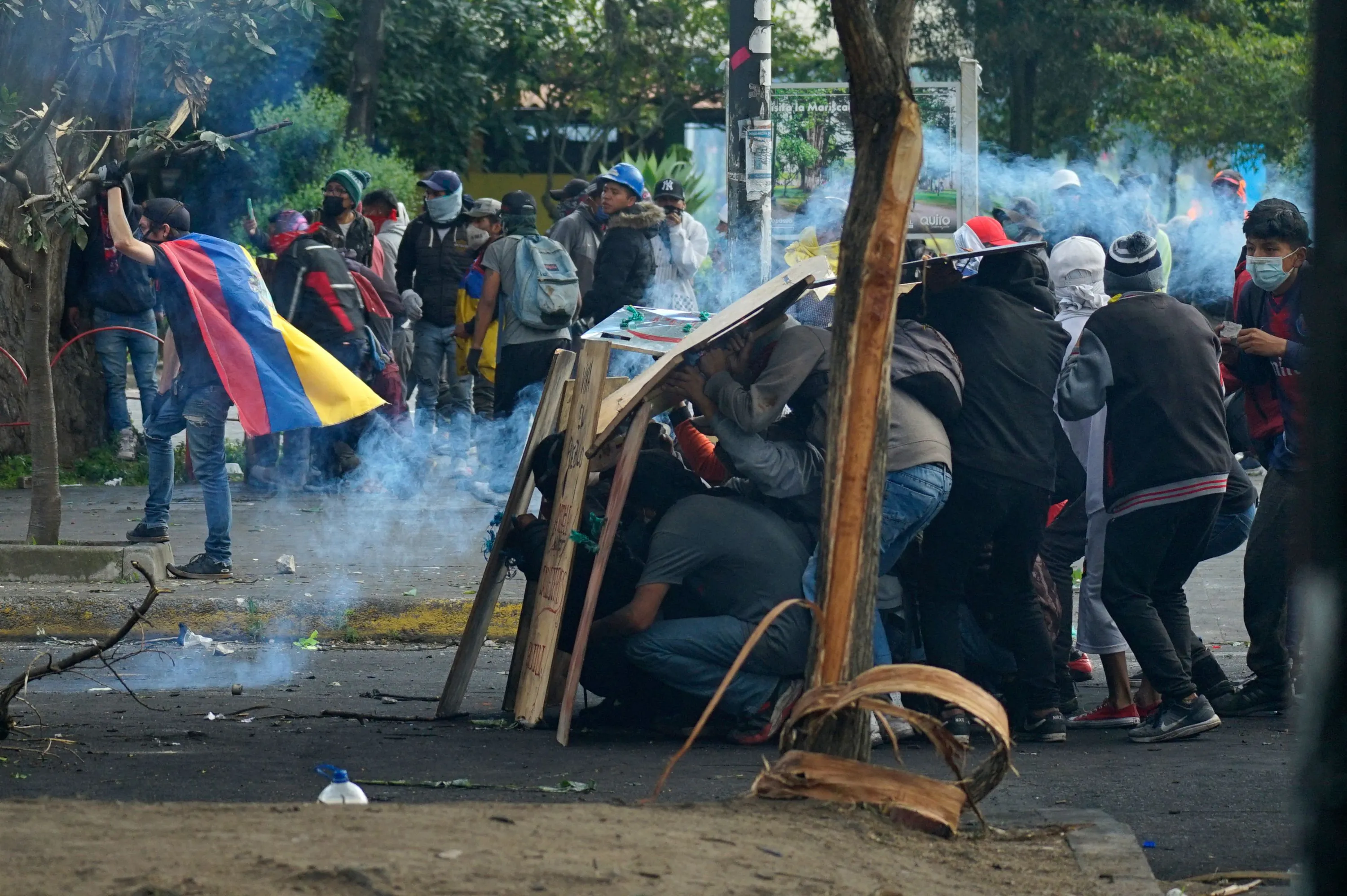 Demonstrators clash with the police in the surroundings of the House of Ecuadorean Culture in Quito, on June 22, 2022, on the tenth consecutive day of indigenous-led protests against the government. Ecuador on Wednesday refused to end its state of emergency and said 18 police officers are “missing” following an attack by indigenous protesters on a police station in the eastern Amazon region. Two people died in clashes with law enforcement during indigenous-led fuel price protests that have triggered regional states of emergency and a curfew in the capital Quito. (Photo by Veronica Lombeida/AFP Photo)