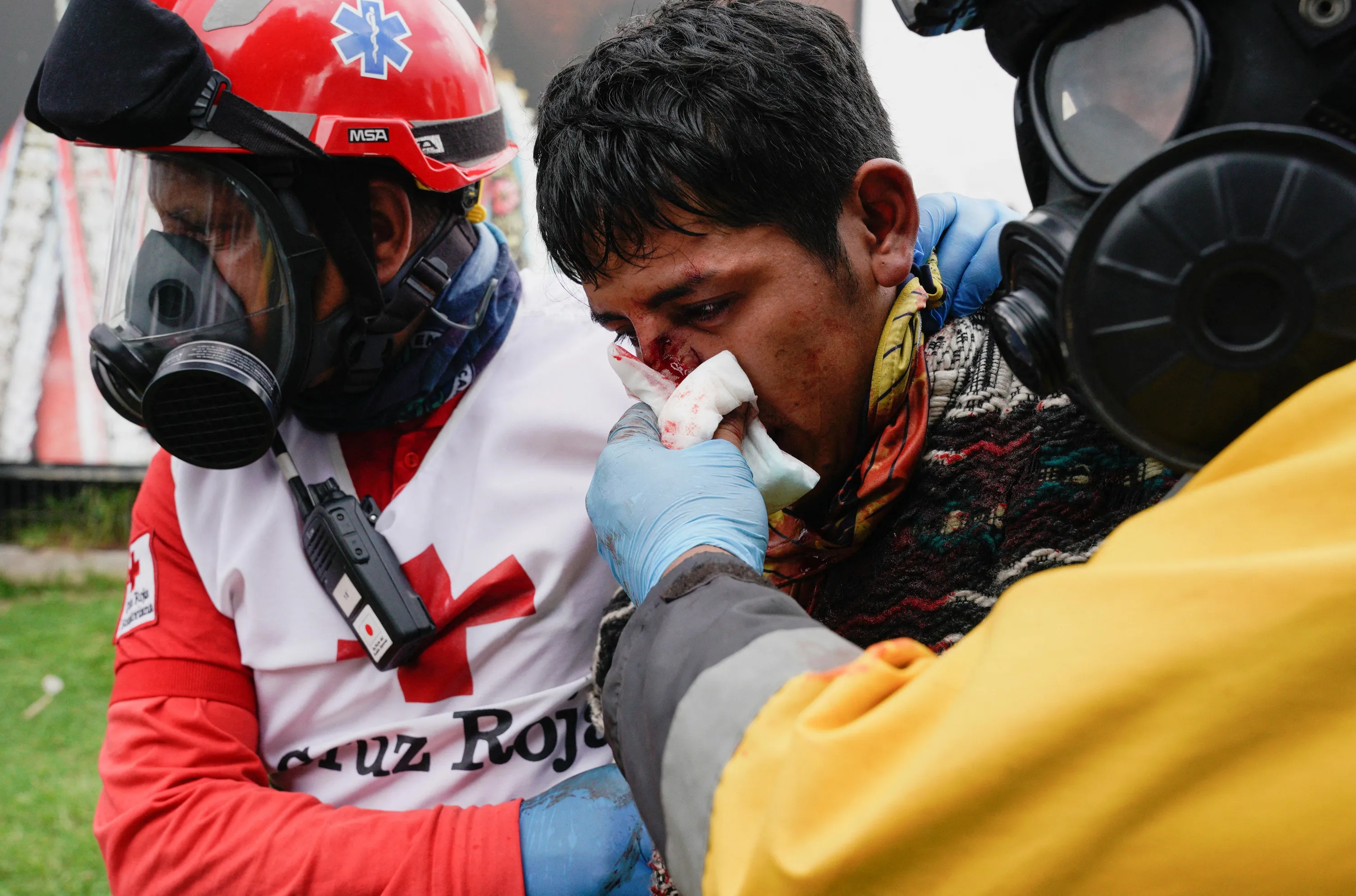 An injured demonstrator receives medical attention during an anti-government protest amid a stalemate between the government of President Guillermo Lasso and largely indigenous demonstrators who demand an end to emergency measures, in Quito, Ecuador on June 23, 2022. (Photo by Santiago Arcos/Reuters)
