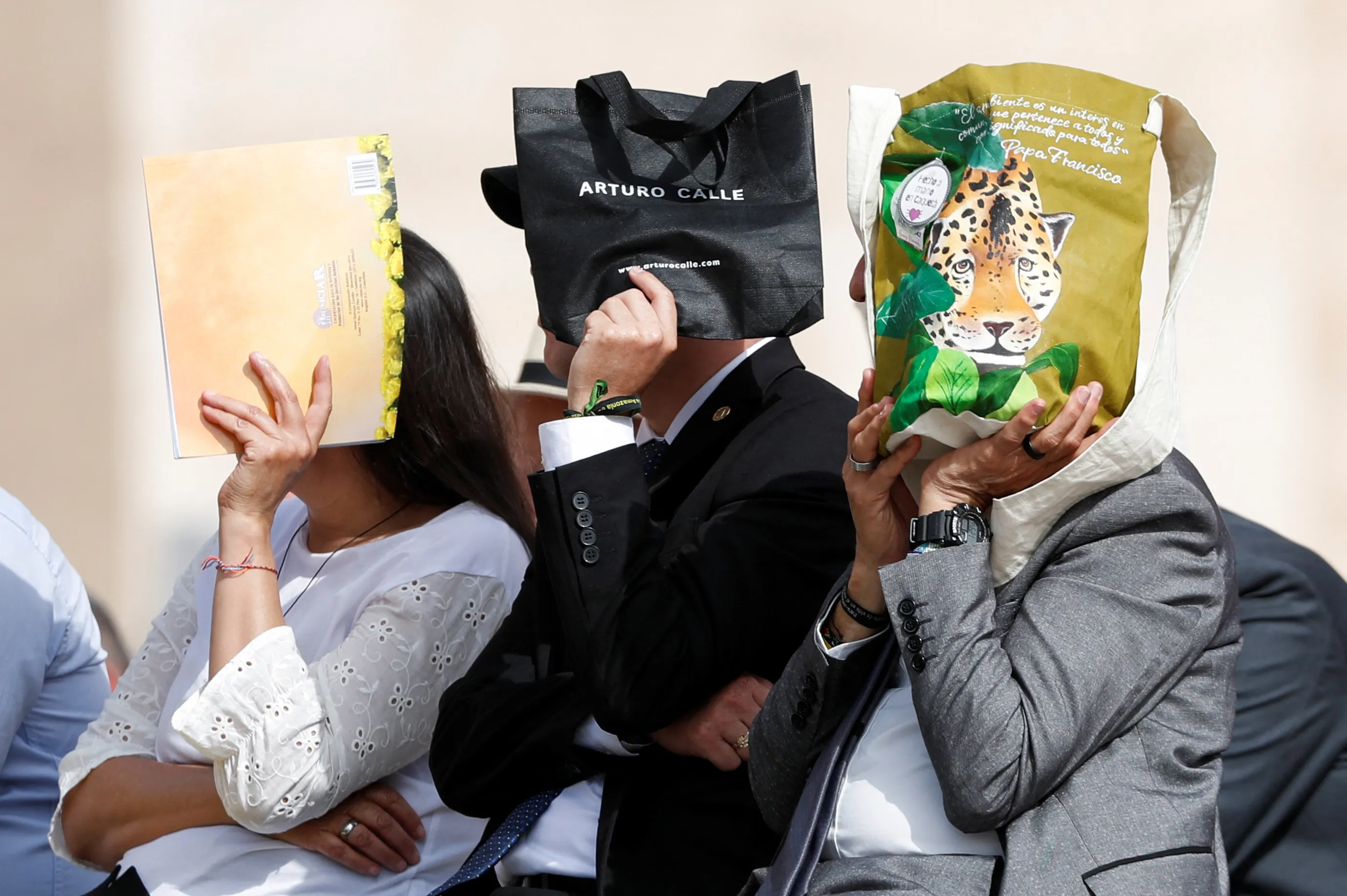 People cover themselves from the sun as Pope Francis holds the weekly general audience at the Vatican on June 22, 2022. (Photo by Remo Casilli/Reuters)