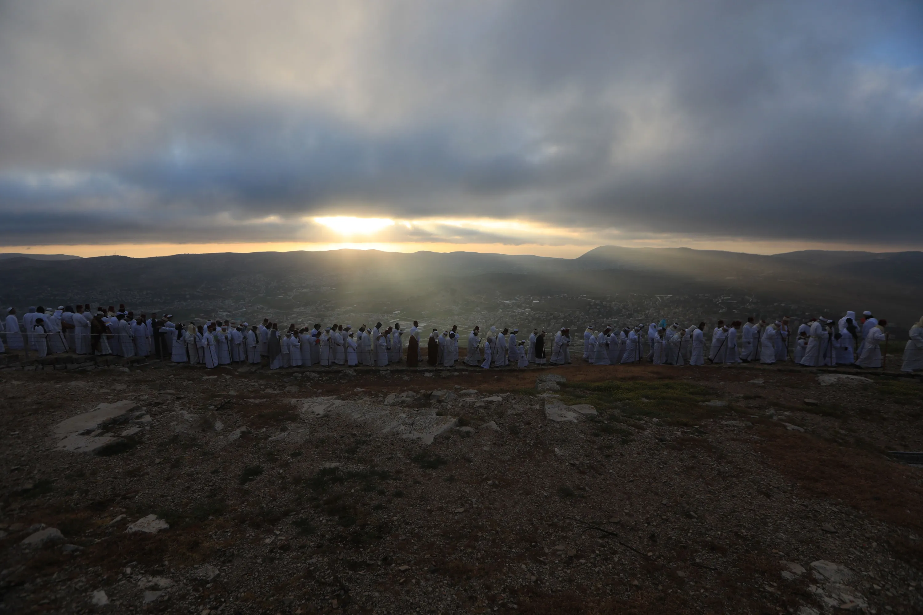 Members of the Samaritan community attend a religious service marking the end of their Passover holiday atop Mount Gerizim, above the West Bank city of Nablus, 21 April 2022. According to tradition, the Samaritans are descendants of the Jews who were not deported when the Assyrians conquered Israel in 722 BC. The small community numbers about 810 people, half of them live in a village at Mount Gerizim, near the Palestinian city of Nablus, and the rest in Holon near Tel Aviv in Israel. (Photo by Alaa Badarneh/EPA/EFE)