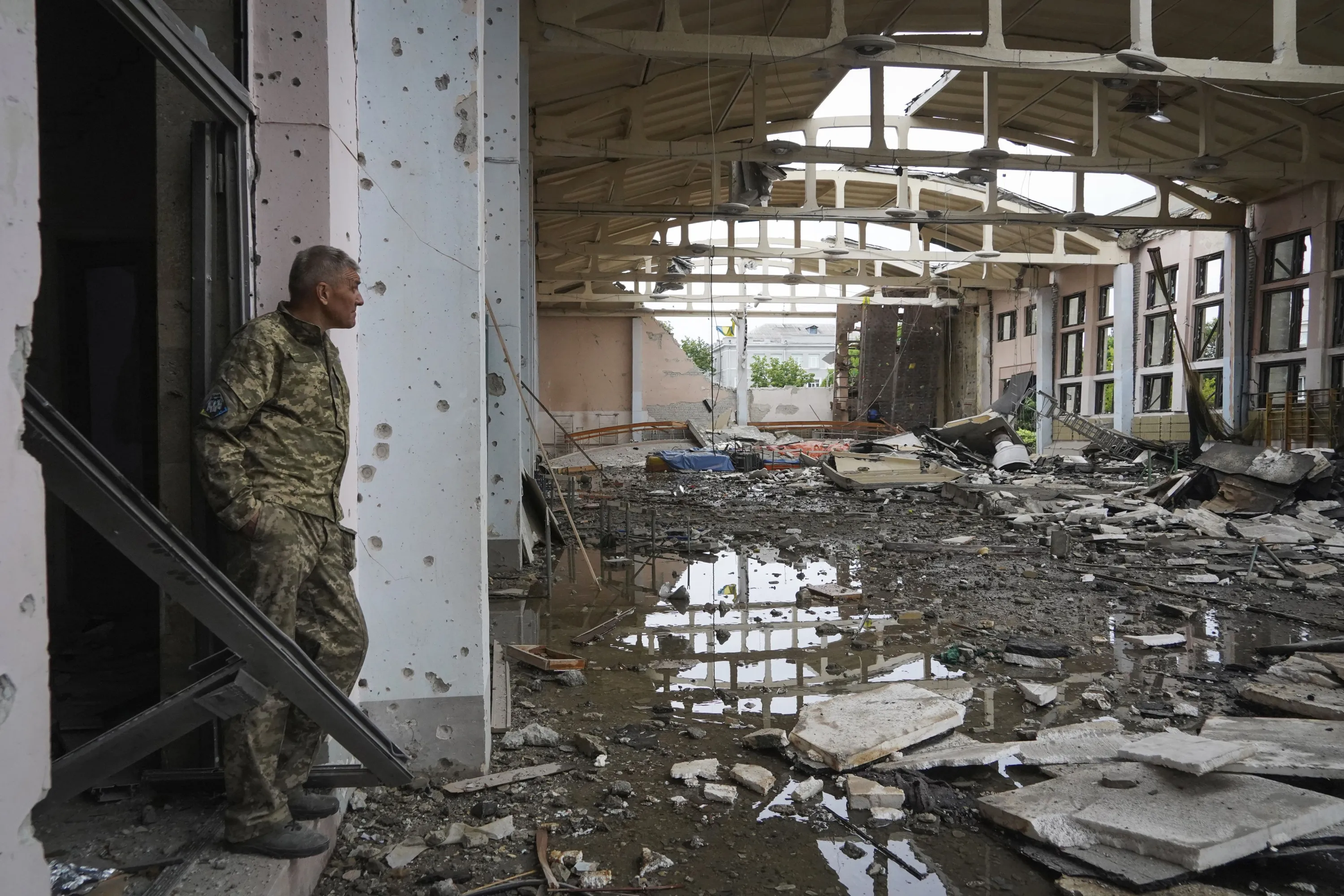 A Ukrainian serviceman looks at the ruins of the sports complex of the National Technical University in Kharkiv, Ukraine, Friday, June 24, 2022, damaged during a night shelling. The building received significant damage. A fire broke out in one part but firefighters managed to put it out. (Photo by Andrii Marienko/AP Photo)