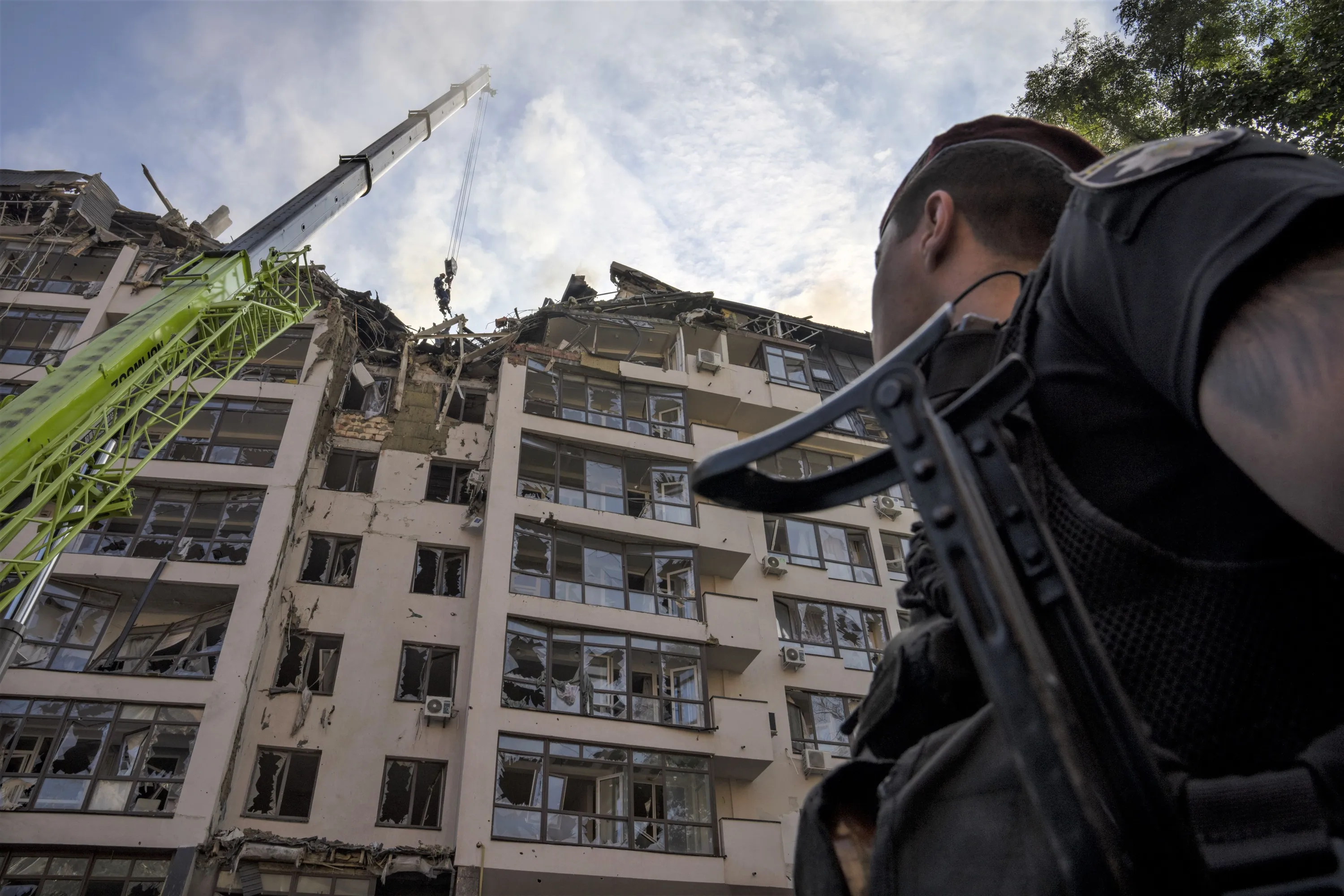Servicemen work at the scene at a residential building following explosions, in Kyiv, Ukraine, Sunday, June 26, 2022. Several explosions rocked the west of the Ukrainian capital in the early hours of Sunday morning, with at least two residential buildings struck, according to Kyiv mayor Vitali Klitschko. (Photo by Nariman El-Mofty/AP Photo)