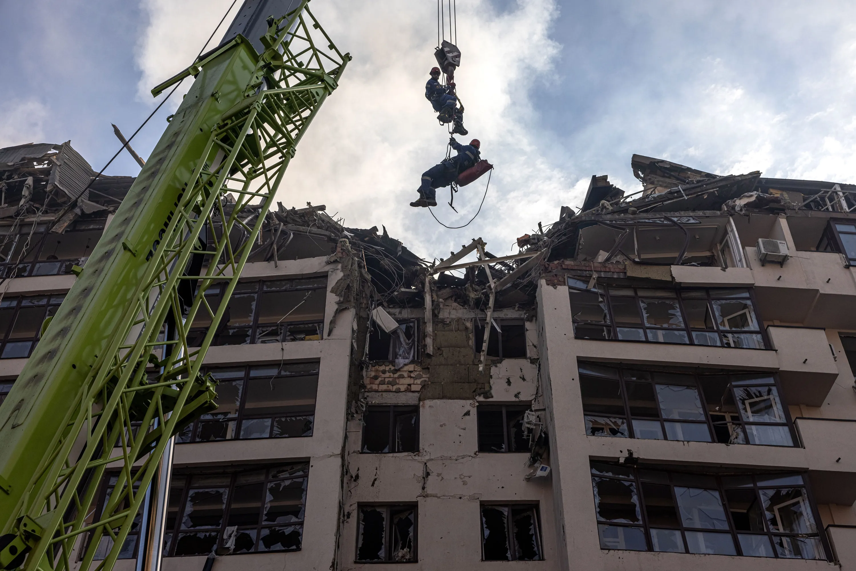 Rescuers in action next to a damaged residential building following Russian airstrikes in the Shevchenkivskiy district of Kyiv (Kiev), Ukraine, 26 June 2022. Multiple airstrikes hit the center of Kyiv in the morning. Russian troops on 24 February entered Ukrainian territory, starting the conflict that has provoked destruction and a humanitarian crisis. (Photo by Roman Pilipey/EPA/EFE)