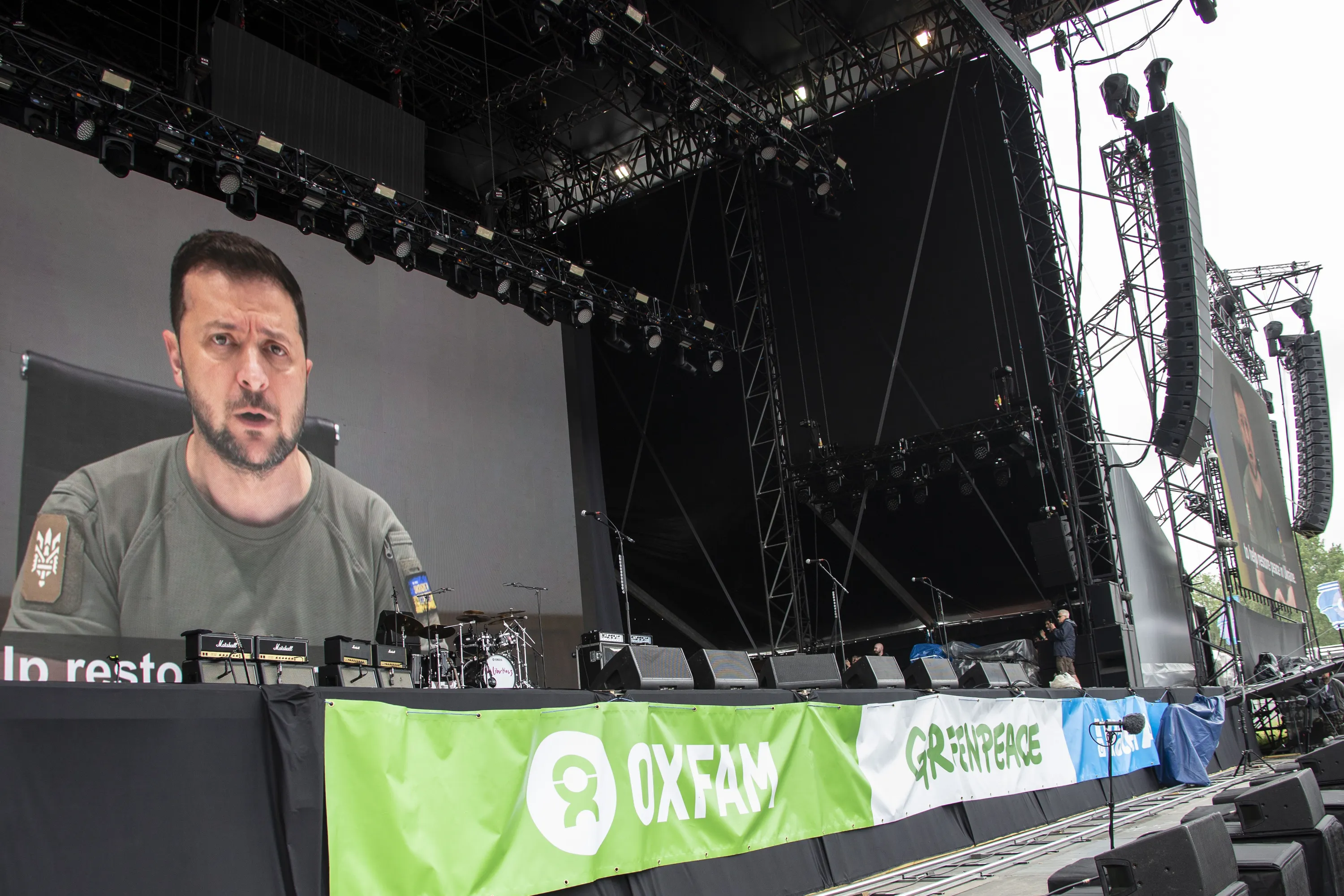 Ukrainian President Volodymyr Zelenskyy speaks via video at the Glastonbury Festival in Worthy Farm, Somerset, England, Friday, June 24, 2022. (Photo by Joel C. Ryan/Invision/AP Photo)
