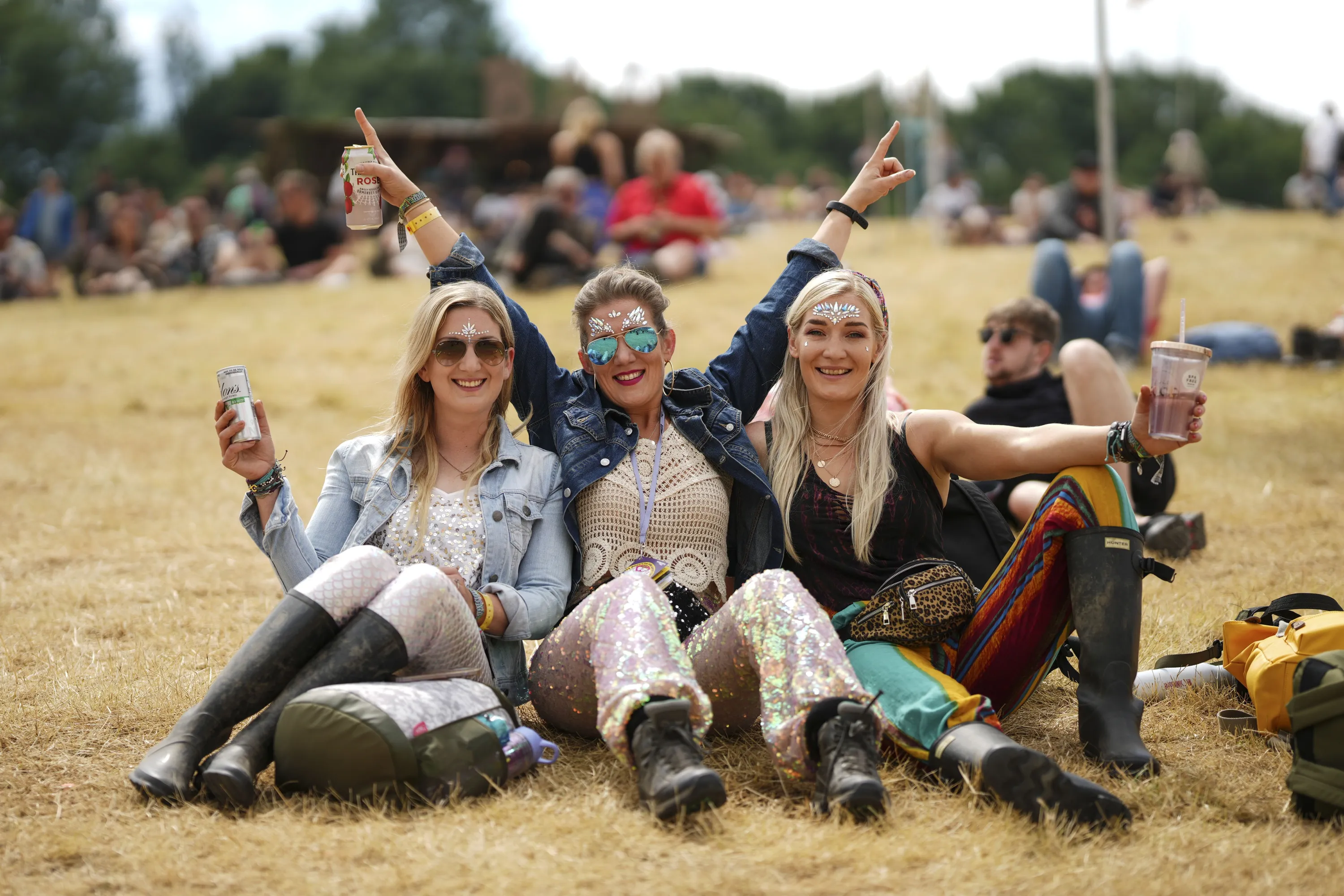 Festival goers enjoy a drink at the Glastonbury Festival in Worthy Farm, Somerset, England, Friday, June 24, 2022. (Photo by Scott Garfitt/AP Photo)