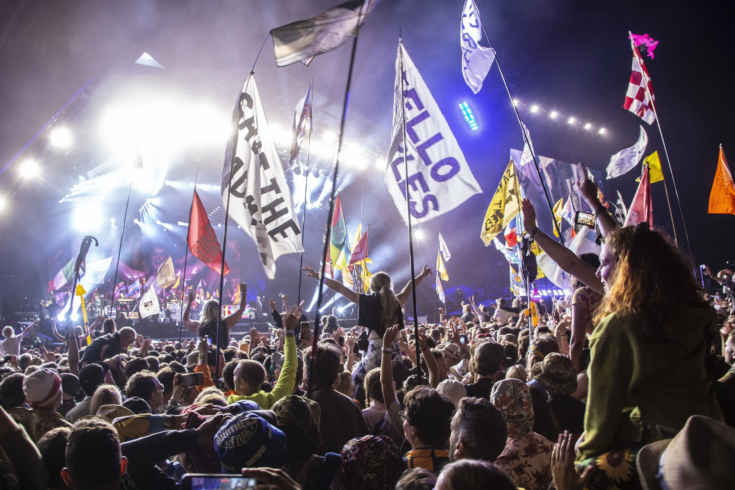 Festival goers watch Paul McCartney perform at Glastonbury Festival in Worthy Farm, Somerset, England, Saturday, June 25, 2022. (Photo by Joel C. Ryan/Invision/AP Photo)