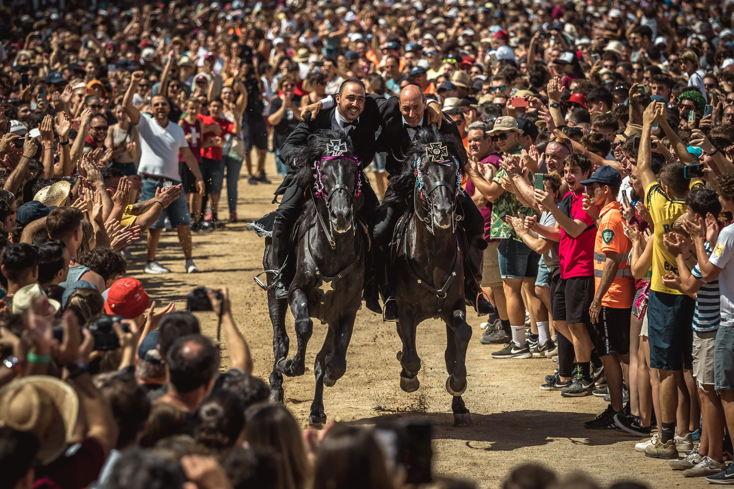 Two “caixers” (horse riders) gallop together with their arms entwined during the training session for the “Jocs des Pla” (medieval tournament) during the traditional “Sant Joan” (Saint John) festival in Ciutadella de Menorca, Spain on June 24, 2022. (Photo by Matthias Oesterle/Rex Features/Shutterstock)