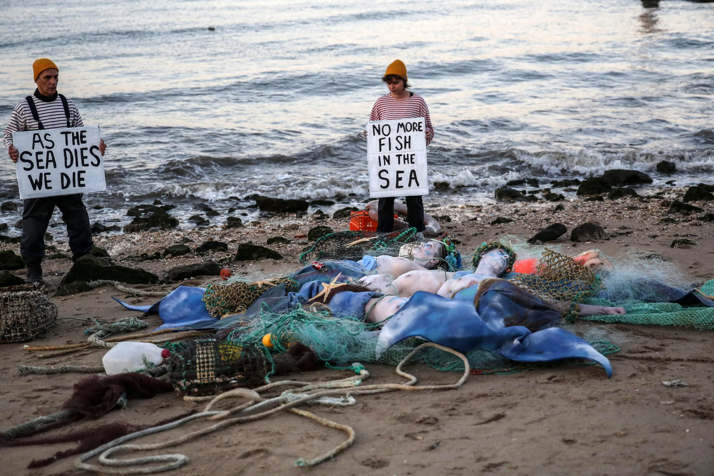 Ocean Rebellion activists hold banners reading “As the sea dies we die” and “No more fish in the sea” as they stage a protest in Terreiro do Paco in Lisbon on June 27, 2022, before the UN Ocean Conference opening. A long-delayed UN conference on how to restore the faltering health of global oceans kicks off in Lisbon, with thousands of policymakers, experts and advocates on the case. (Photo by Carlos Costa/AFP Photo)