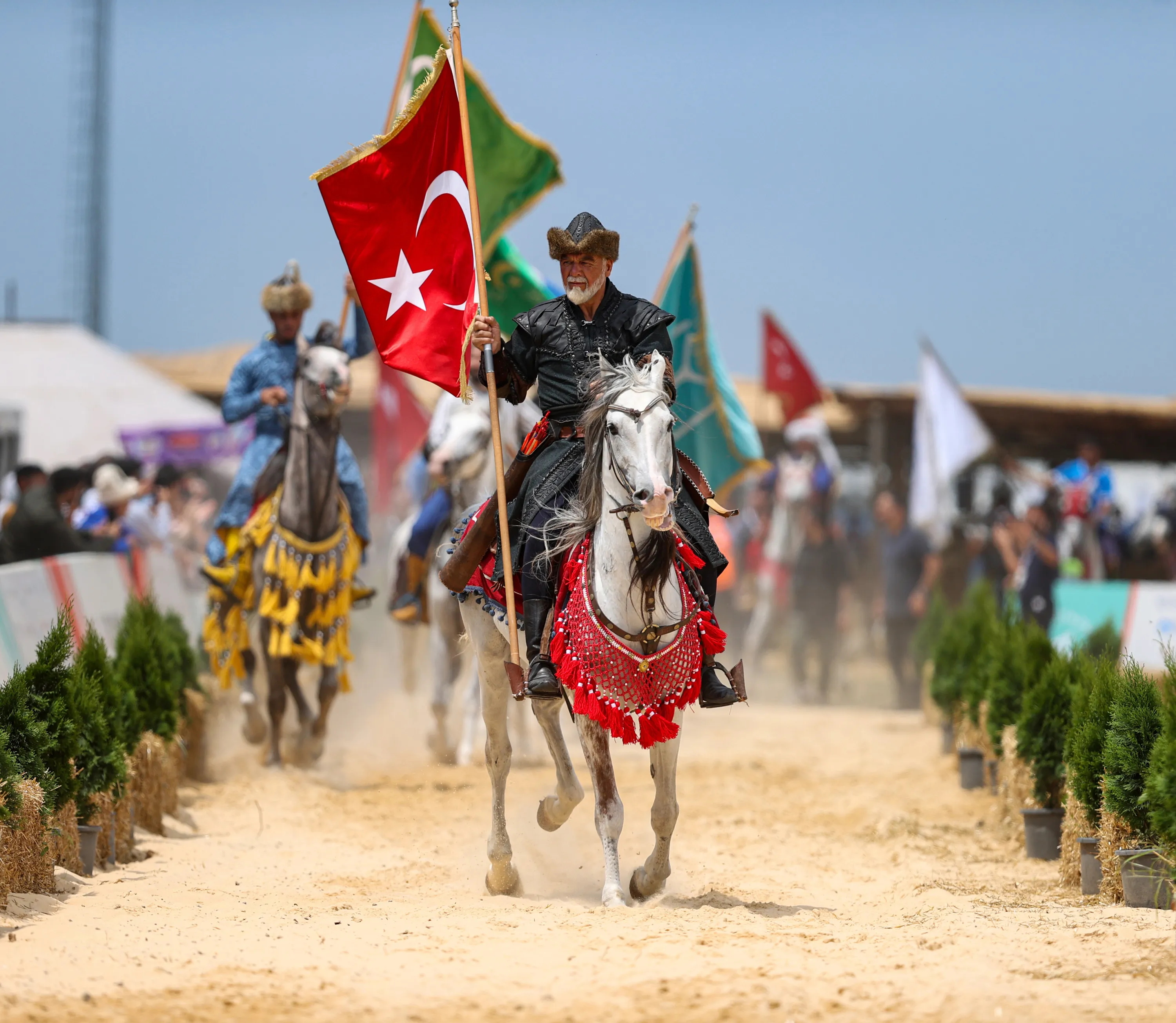 Kokboru, traditional horse game, team perform at the opening ceremony of the 5th Etnospor Culture Festival held at Ataturk Airport, in Istanbul, Turkiye on June 09, 2022. (Photo by Ali Atmaca/Anadolu Agency via Getty Images)