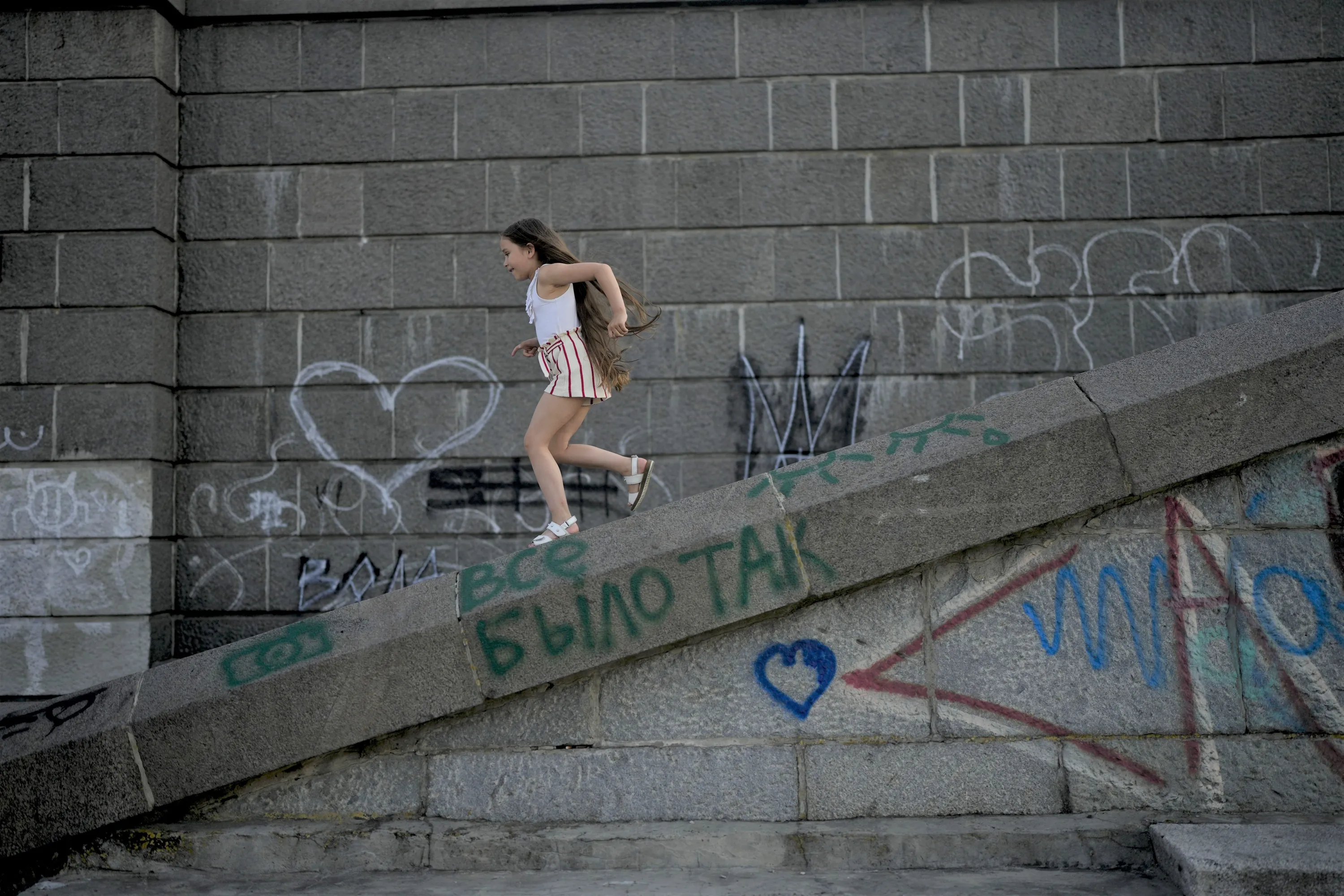 A girl plays in Kyiv, Ukraine, Friday, June 10, 2022. With war raging on fronts to the east and south, the summer of 2022 is proving bitter for the Ukrainian capital, Kyiv. The sun shines but sadness and grim determination reign. (Photo by Natacha Pisarenko/AP Photo)