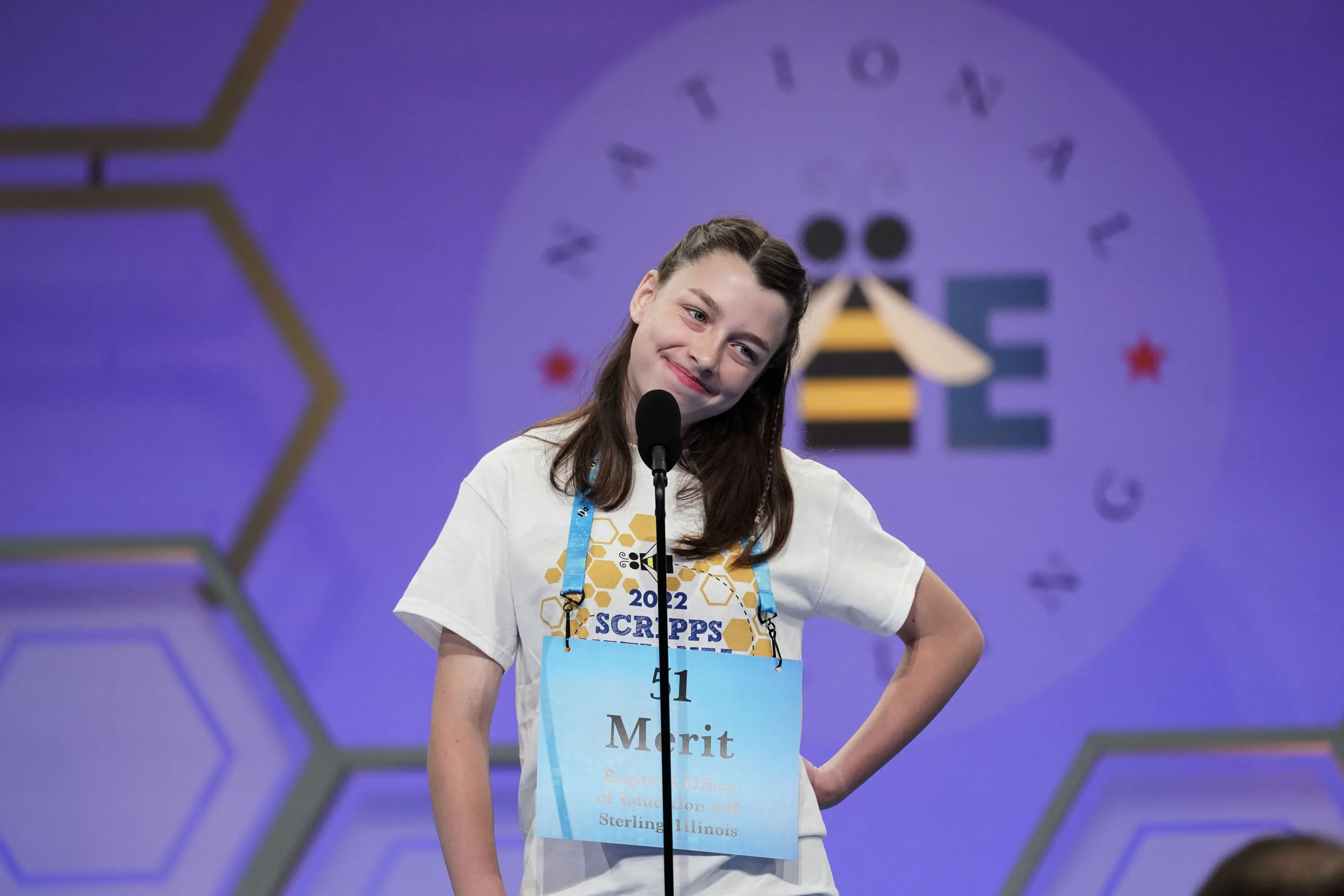 Merit Namaste-Rose, 14, from Oregon, Ill.,stands at the microphone during the Scripps National Spelling Bee, Tuesday, May 31, 2022, in Oxon Hill, Md. (Photo by Alex Brandon/AP Photo)