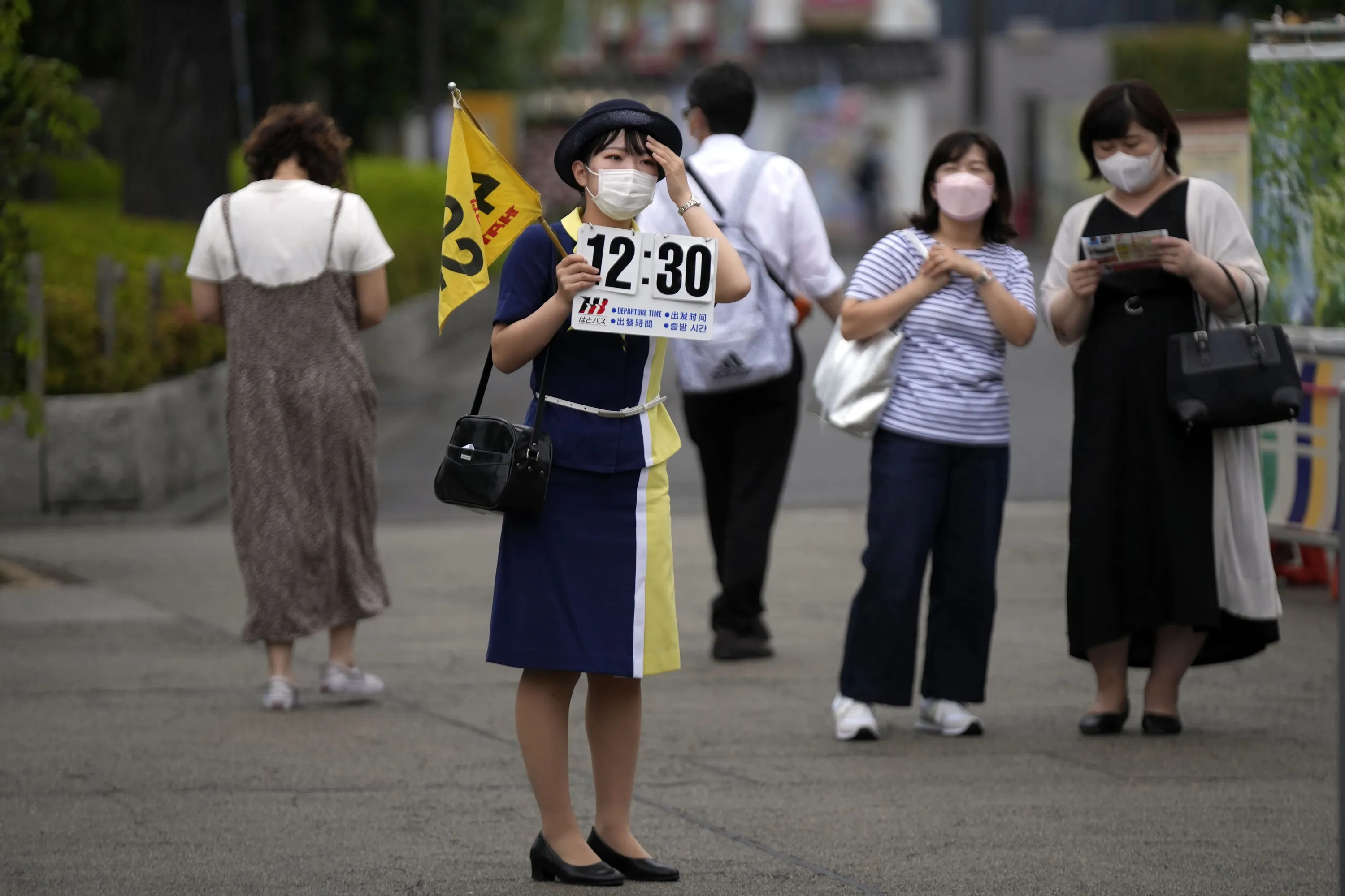 A tour guide wearing a protective mask to help curb the spread of the coronavirus holds a banner showing an assembly time for her tour group near a shopping street at the Asakusa district, Friday, June 10, 2022, in Tokyo. (Photo by Eugene Hoshiko/AP Photo)
