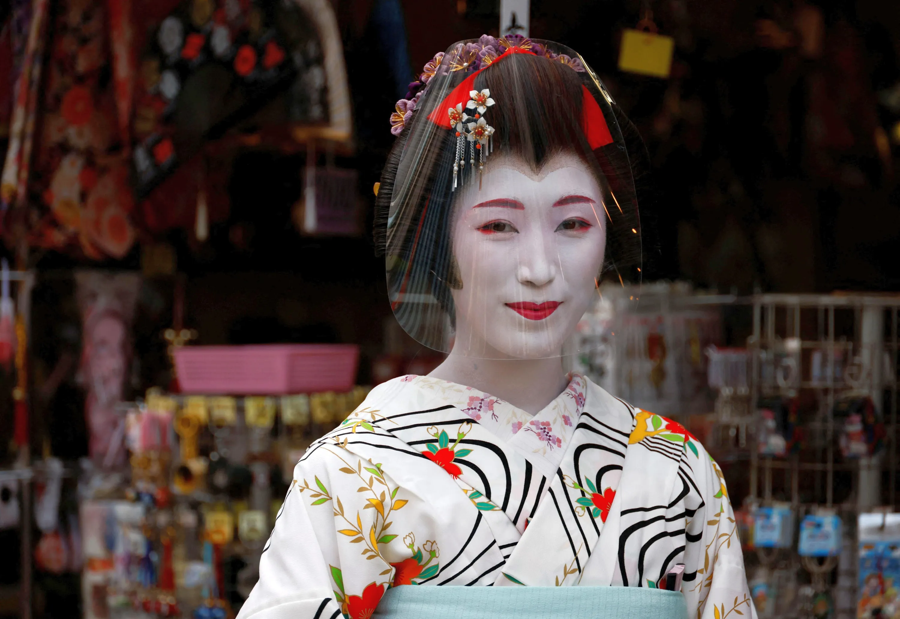 A Geisha, a traditional Japanese female entertainer, wearing a protective face shield, is seen at Nakamise street leading to Senso-ji temple at Asakusa district, a popular sightseeing spot, amid the coronavirus disease (COVID-19) pandemic, in Tokyo, Japan on June 10, 2022. (Photo by Issei Kato/Reuters)