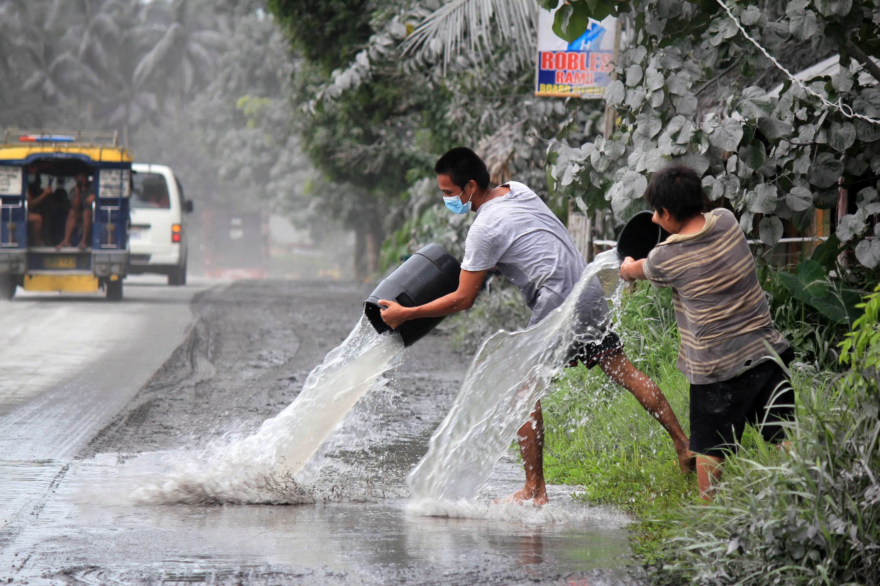 Residents use water to clear ash from the front of their residences in Juban town, Sorsogon Province, after the sudden eruption of Bulusan Volcano on June 5, 2022. (Photo by Sharbyn Sayat/AFP Photo)