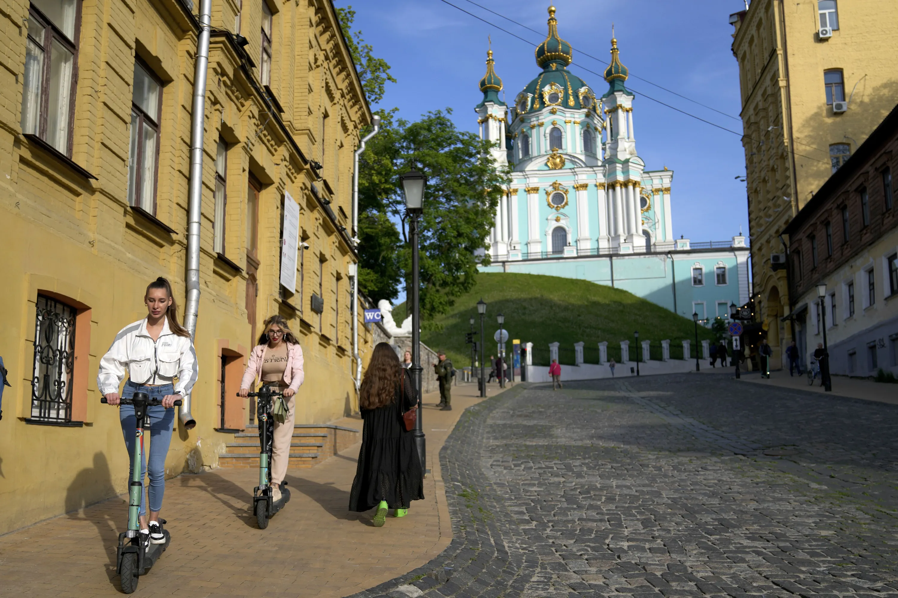 Two women ride scooters in downtown Kyiv, Ukraine, Monday, May 23, 2022. (Photo by Natacha Pisarenko/AP Photo)