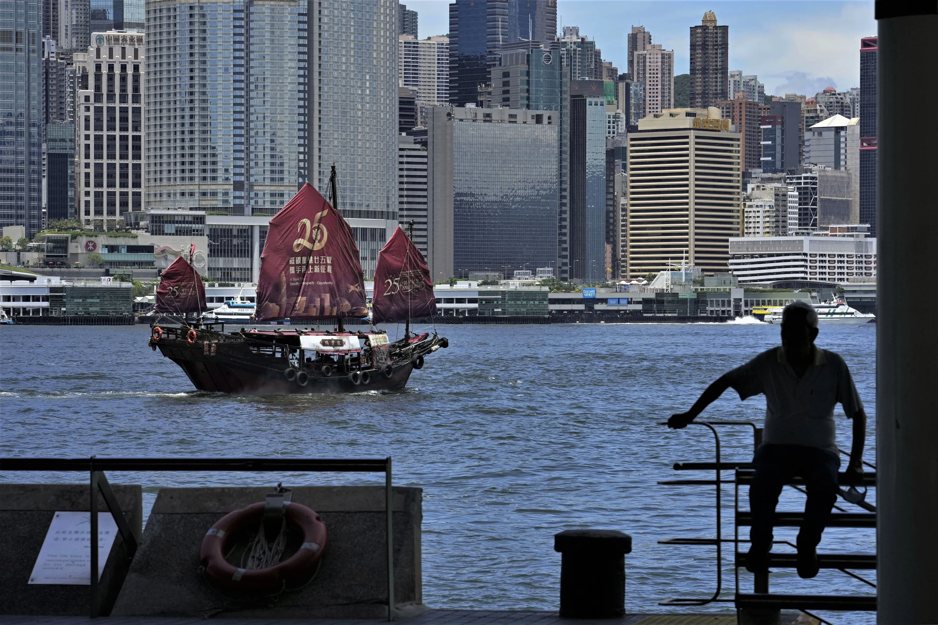A Chinese junk sails across Victoria Harbor to celebrate the 25th anniversary of Hong Kong handover to China, in Hong Kong, Monday, June 27, 2022. (Photo by Kin Cheung/AP Photo)