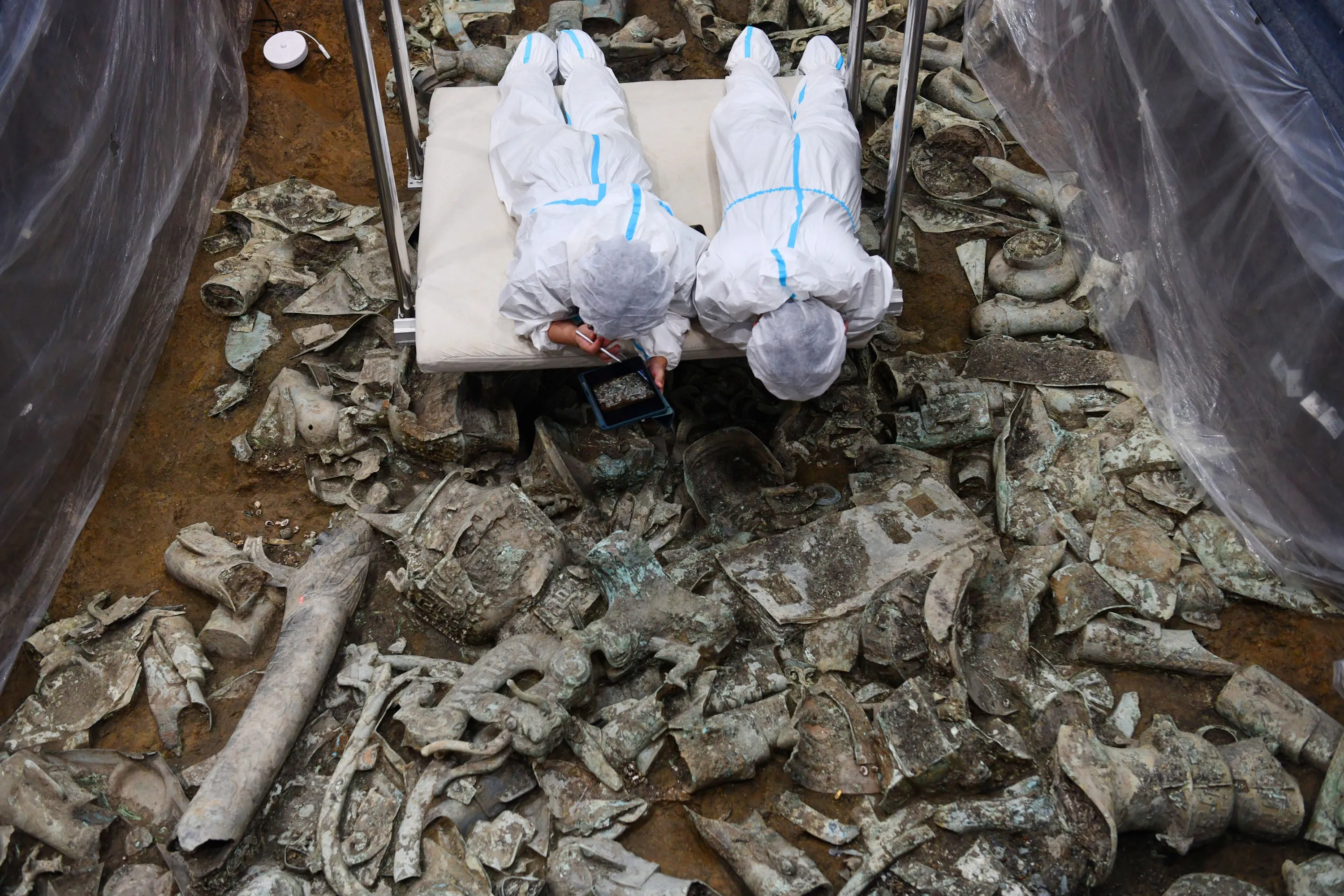 Archaeologists work at No. 8 sacrificial pit of the Sanxingdui Ruins site on June 28, 2022 in Guanghan, Deyang City, Sichuan Province of China. (Photo by Zhang Lang/China News Service via Getty Images)