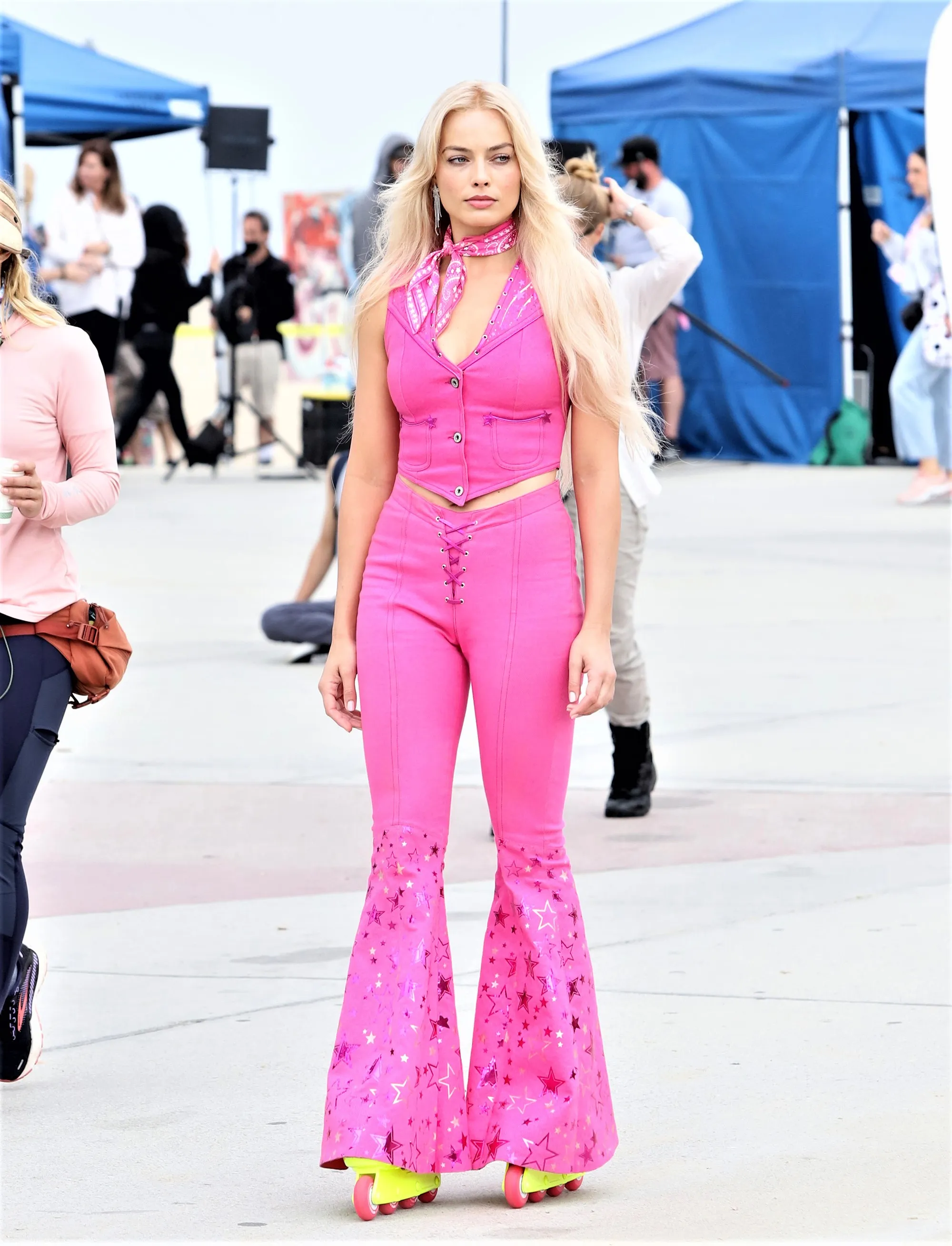 Australian actress Margot Robbie plays Barbie on Roller Skates at the beach in Los Angeles, CA. on June 27, 2022. (Photo by APEX/The Mega Agency)