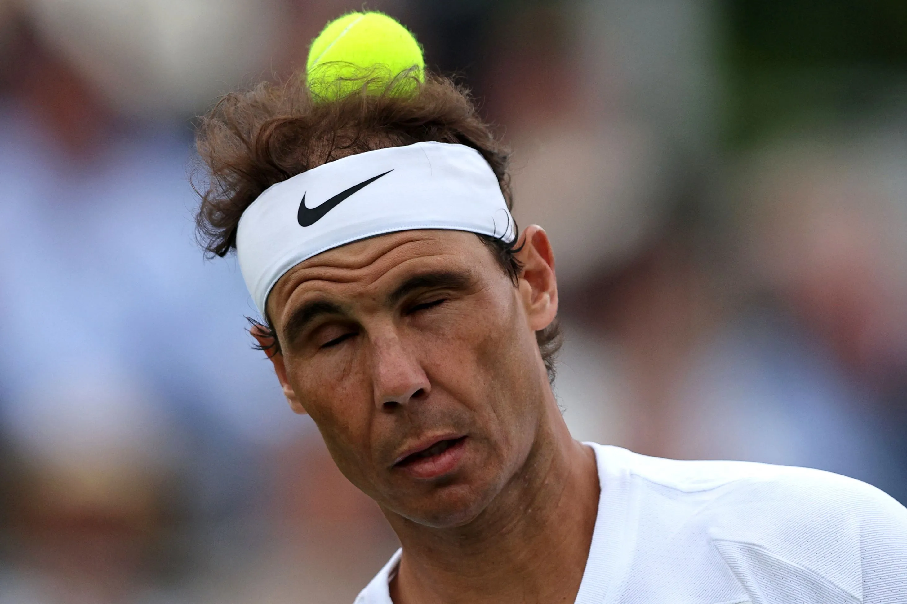 Spain's Rafael Nadal heads the ball as he plays against Canada's Felix Auger-Aliassime during their men's exhibition singles match at The Giorgio Armani Tennis Classic tournament at the Hurlingham Club in London on June 24, 2022. (Photo by Adrian Dennis/AFP Photo)