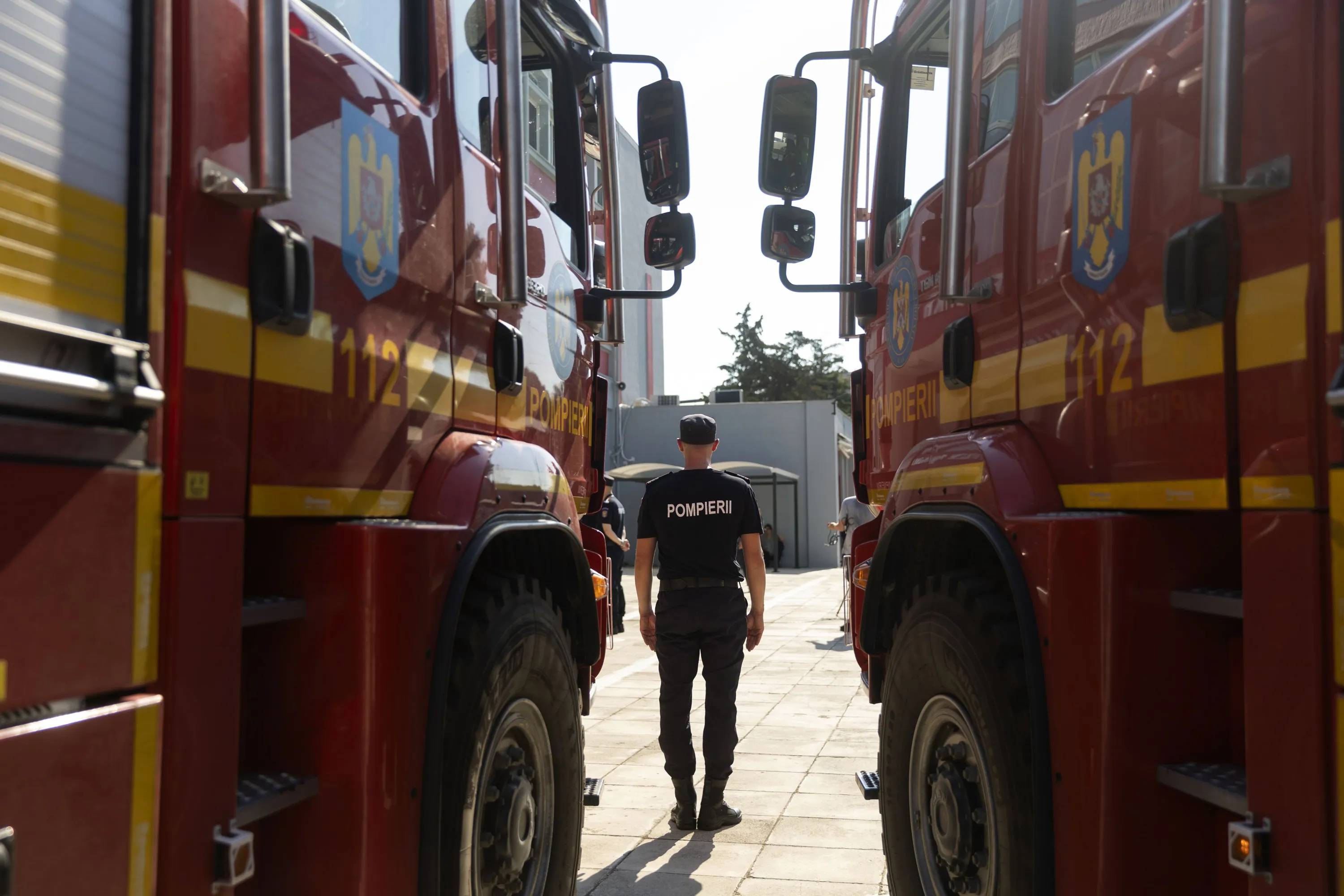 A Romanian firefighter stands in front of a fire engine during a ceremony, in Athens, on Saturday, July 2, 2022. Twenty eight Romanian firefighters, the first of more than 200 firefighters from other European countries that will help their Greek colleagues in fighting wildfires, were welcomed by Climate Crisis and Civil Protection Minister Christos Stylianides and the leadership of Greece's Fire Service. (Photo by Yorgos Karahalis/AP Photo)