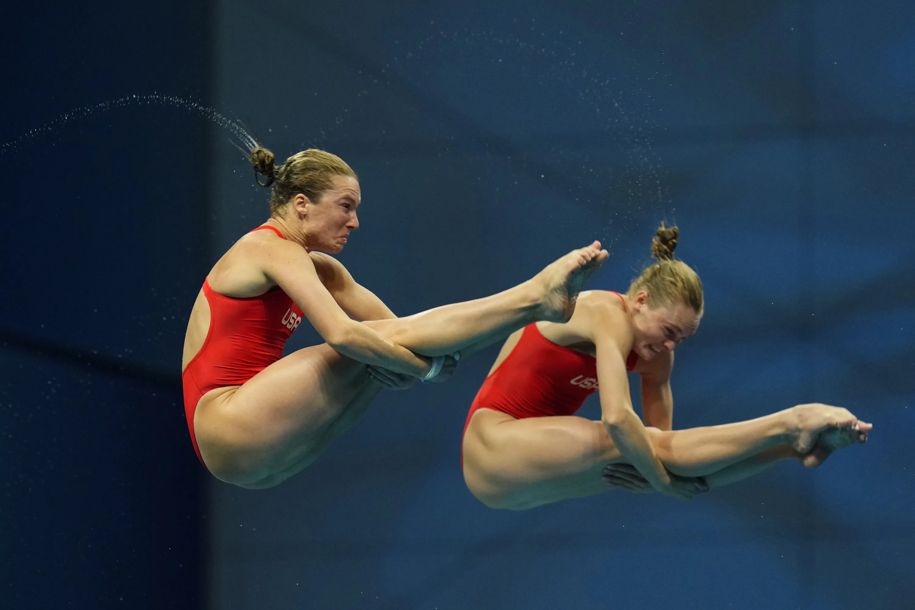 Delaney Schnell and Katrina Young of the United States compete during the women's diving synchronized 10m platform final at the 19th FINA World Championships in Budapest, Hungary, Thursday, June 30, 2022. (Photo by Petr David Josek/AP Photo)