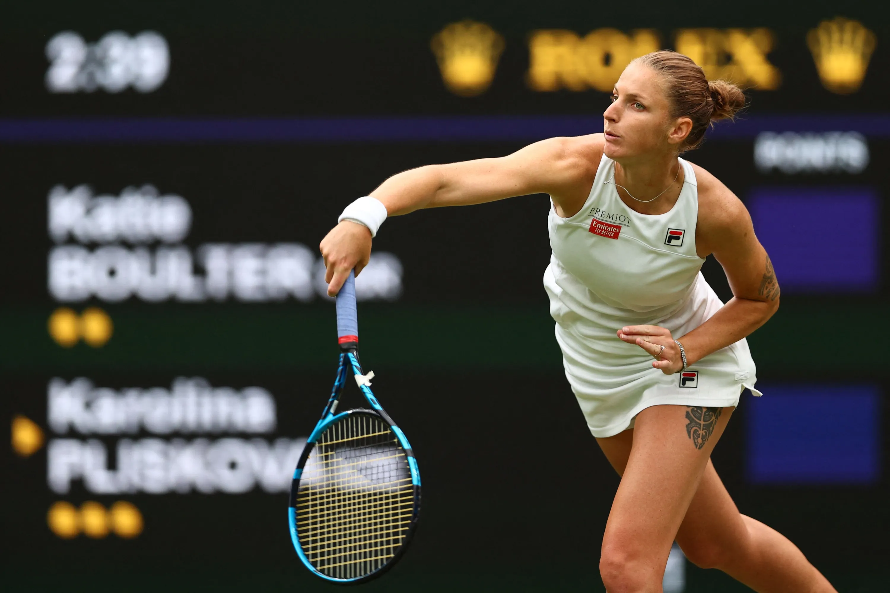 Czech Republic's Karolina Pliskova serves the ball to Britain's Katie Boulter during their women's singles tennis match on the fourth day of the 2022 Wimbledon Championships at The All England Tennis Club in Wimbledon, southwest London, on June 30, 2022. (Photo by Adrian Dennis/AFP Photo)
