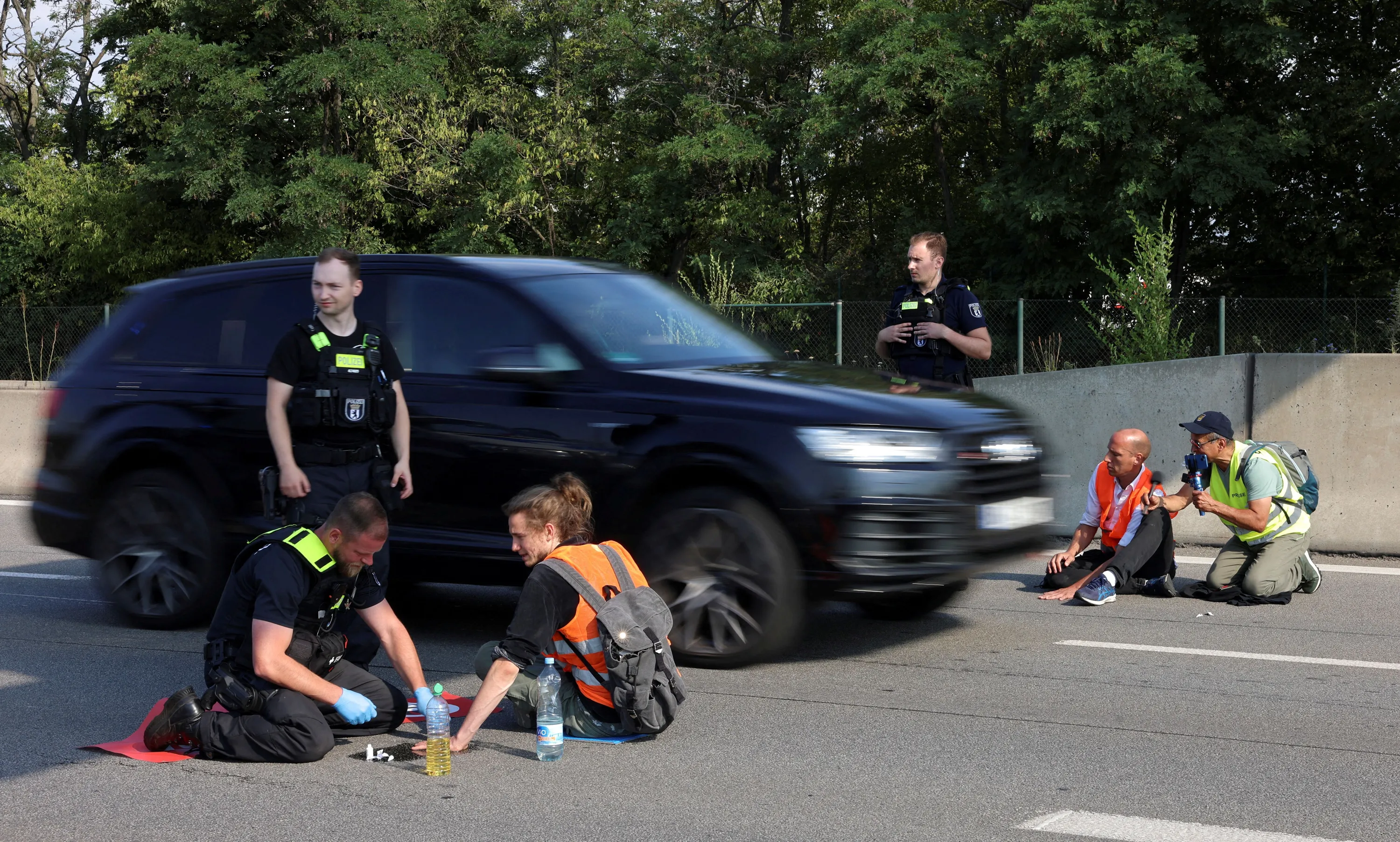 A police officer removes a “Letzte Generation” (Last Generation) activist that glued his hand to the road, as they block a highway under the slogan “Let's stop the fossil madness!” for an end to fossil fuels and against oil drilling in the North Sea, in Berlin, Germany on July 4, 2022. (Photo by Christian Mang/Reuters)