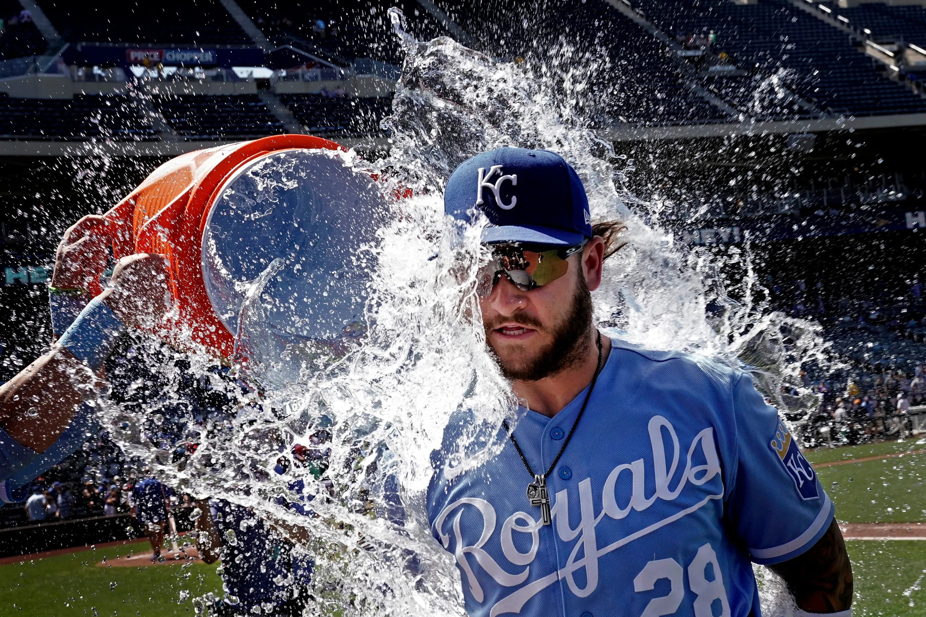 Kansas City Royals' Kyle Isbel is doused by teammates after their baseball game against the Texas Rangers Wednesday, June 29, 2022, in Kansas City, Mo. The Royals won 2-1. (Photo by Charlie Riedel/AP Photo)