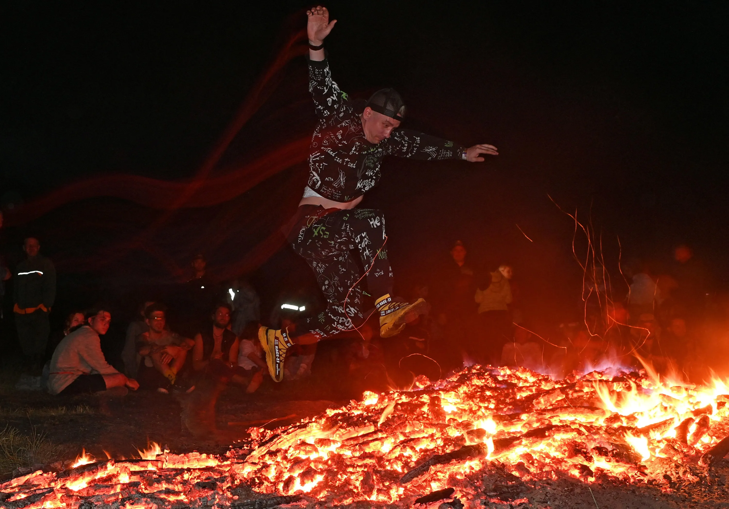 A man jumps over a fire during the celebration of the summer solstice at a festival in the village of Okunevo in Omsk region, Russia on June 21, 2022. (Photo by Alexey Malgavko/Reuters)