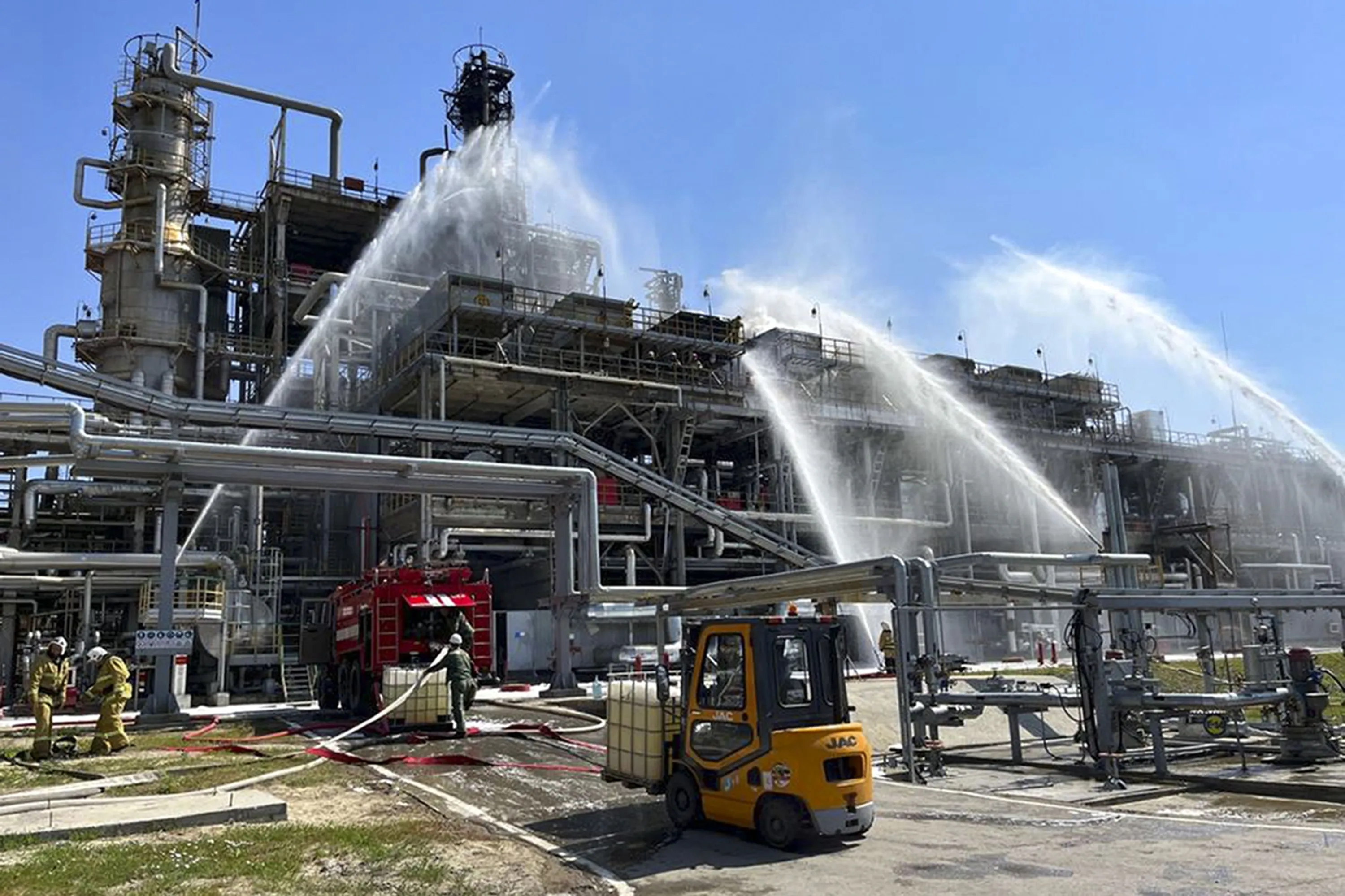 In this handout photo released by Russian Emergency Ministry Press Service, Russian Emergency Situation ministry's firefighters work at the scene of a fire at the Novoshakhtinsk oil processing plant in the Rostov-on-Don region in Russia, Wednesday, June 22, 2022. A drone strike caused a fire at a refinery in southwestern Russia near the border with Ukraine on Wednesday, but no one was hurt and the blaze was contained quickly, officials said. (Photo by Russian Emergency Ministry Press Service via AP Photo)
