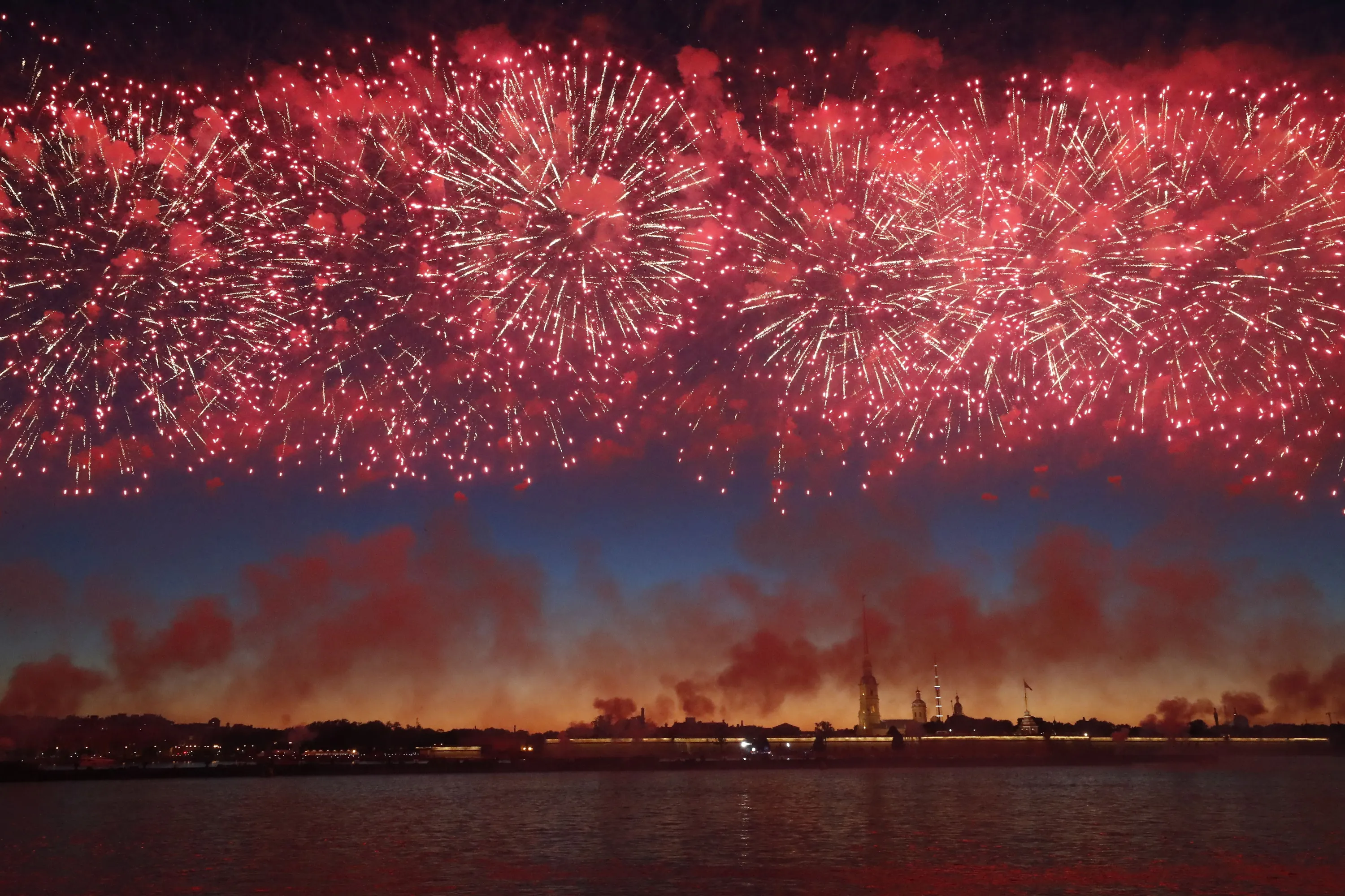 Fireworks over the Peter and Paul Fortress at the Neva River during the Scarlet Sails celebration in St. Petersburg, Russia, 25 June 2022. The traditional celebration is organized in honor of students of elementary and high schools, as well as military academies as they finish their educational terms and hold graduation ceremonies in the second largest city of Russia. (Photo by Anatoly Maltsev/EPA/EFE)