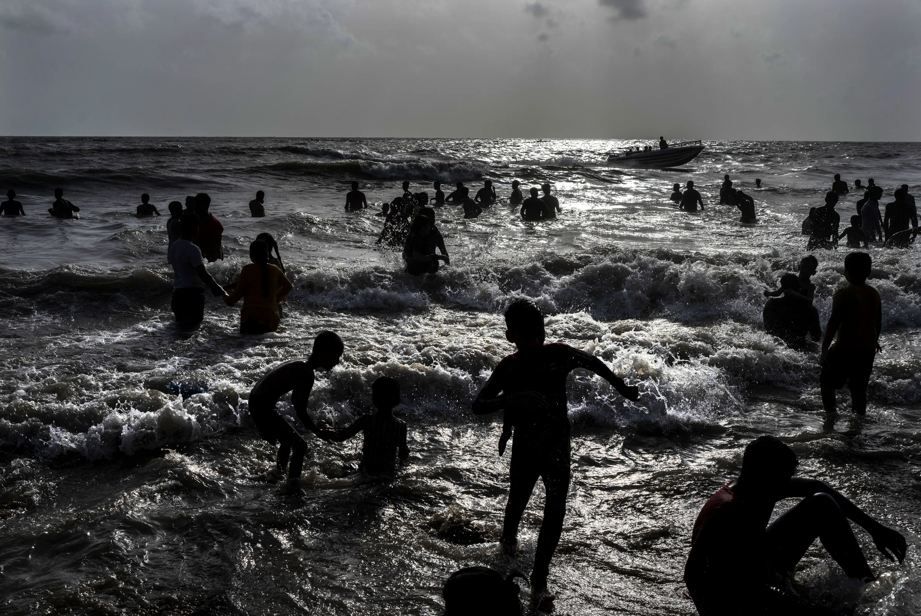Children play at a crowde Juhu beach on the Arabian Sea coast on a hot and humid day in Mumbai, India, Sunday, May 22, 2022. (Photo by Rafiq Maqbool/AP Photo)