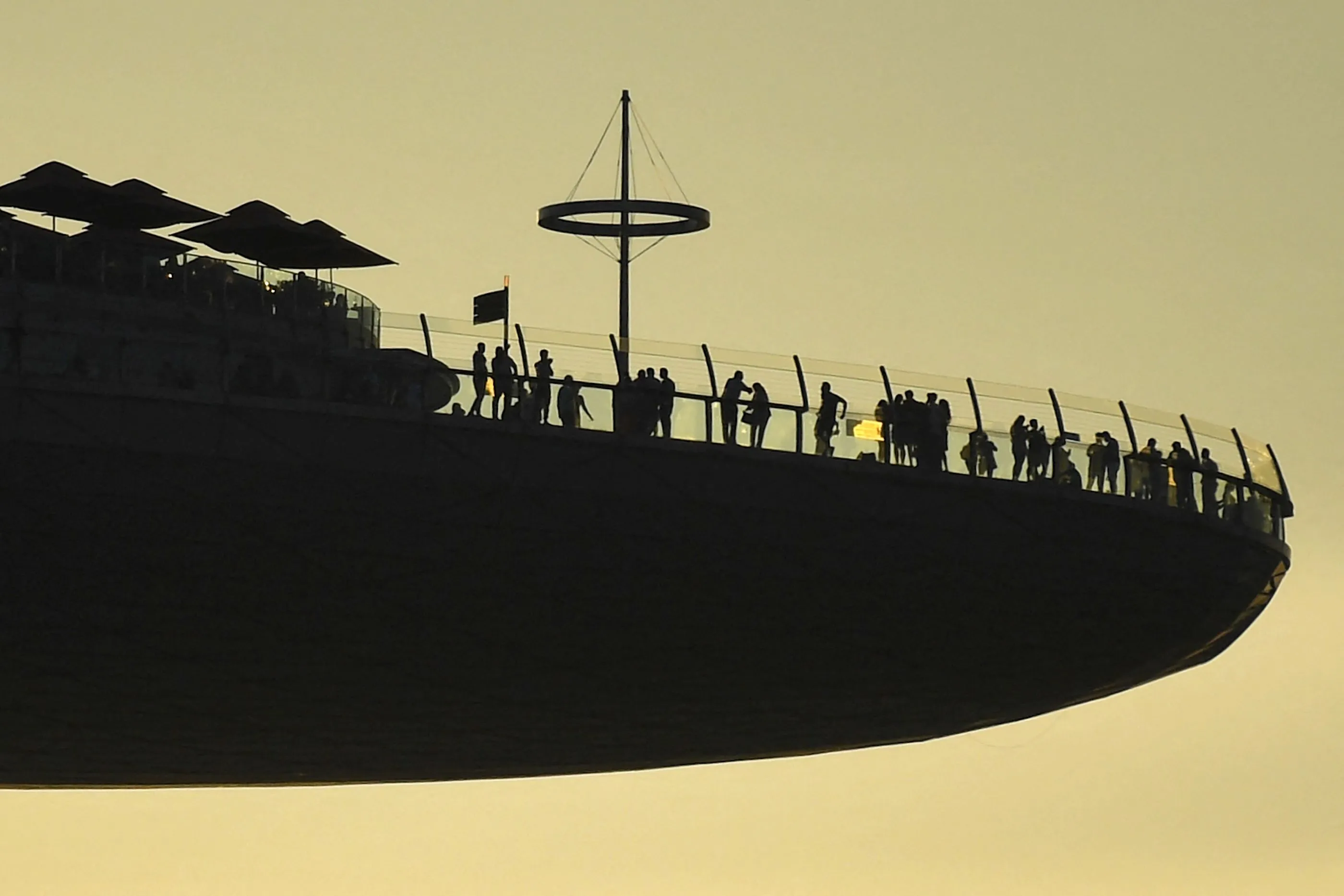 People are silhouetted against the afternoon sun as they view the surroundings from the Marina Bay Sands skypark observation deck in Singapore on June 14, 2022. (Photo by Roslan Rahman/AFP Photo)