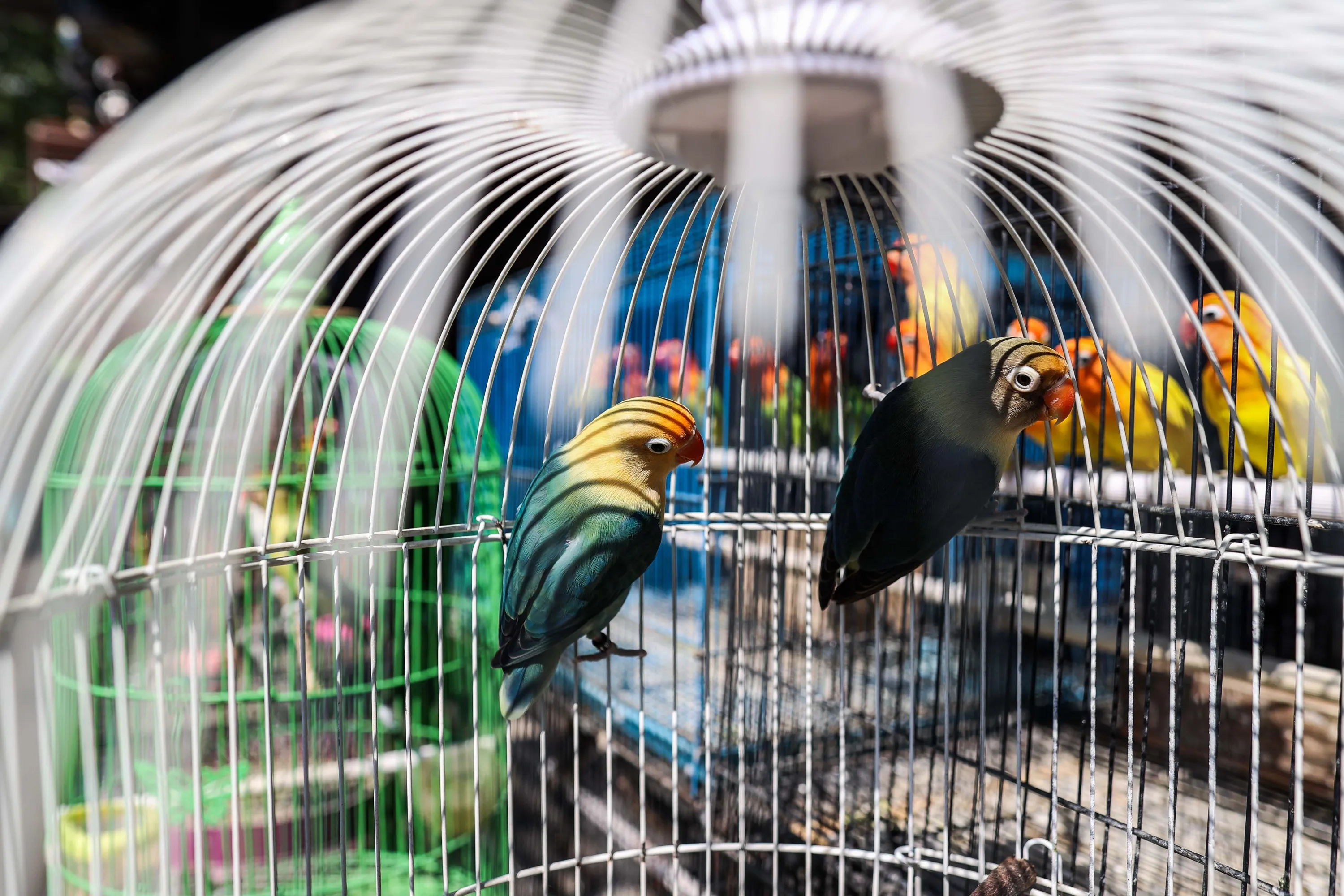 Birds are for sale in cages at the bird market in Malang, East Java Province, Indonesia, June 18, 2022. Around 75 million birds are kept as pets in Java, threatening to wipe out some wild bird populations. Wild birds are smuggled illegally and traded on the black market to meet the demand for the pet trade, collectors, consumption, belief-based use, and even for bird fighting. Birds are one of the most traded groups with over 3,000 species, a third of all surviving species, reportedly affected by the trade. (Photo by Garry Lotulung/Anadolu Agency via Getty Images)