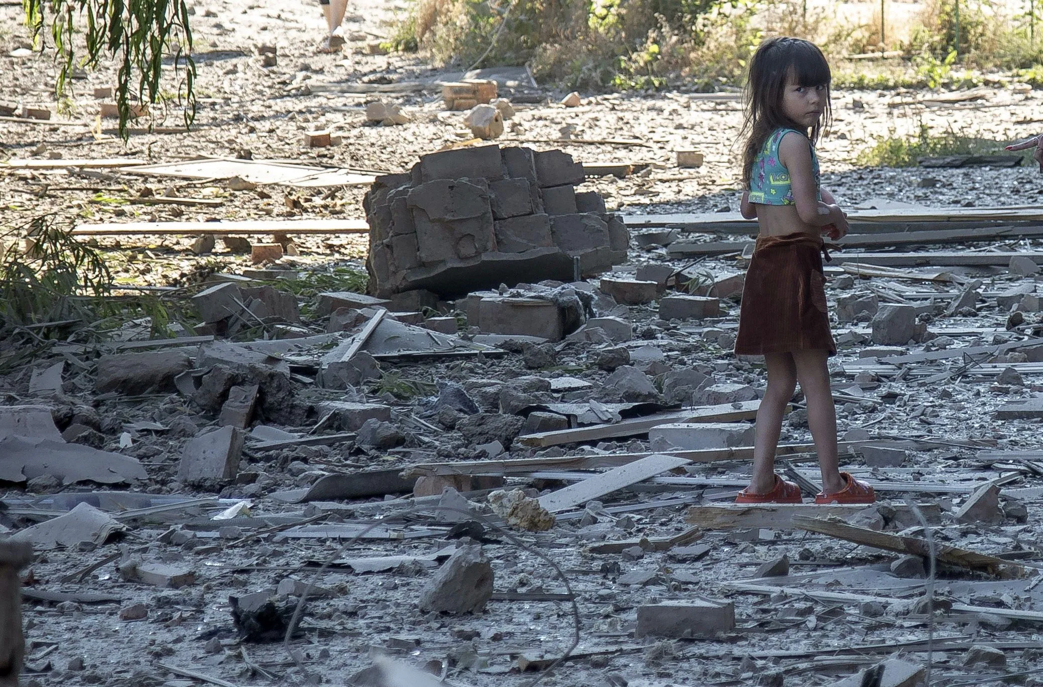 A child walks on the debris left by an explosion following a missile strike on a civilian neighborhood in Bakhmut, Ukraine, July 06th, 2022. (Photo by Narciso Contreras/Anadolu Agency via Getty Images)