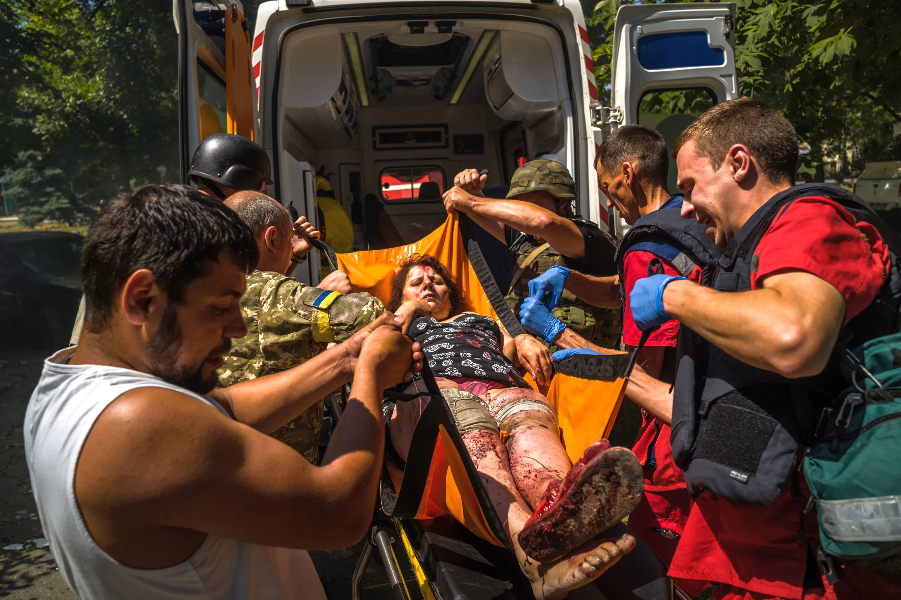 A wounded woman is being transported to an ambulance in Kramatorsk, Ukraine, on July 7, 2022. A missile strike on Kramatorsk in the Donbas region killed one person and injured at least six Thursday, according to the regional governor. (Photo by Wojciech Grzedzinski/The Washington Post)
