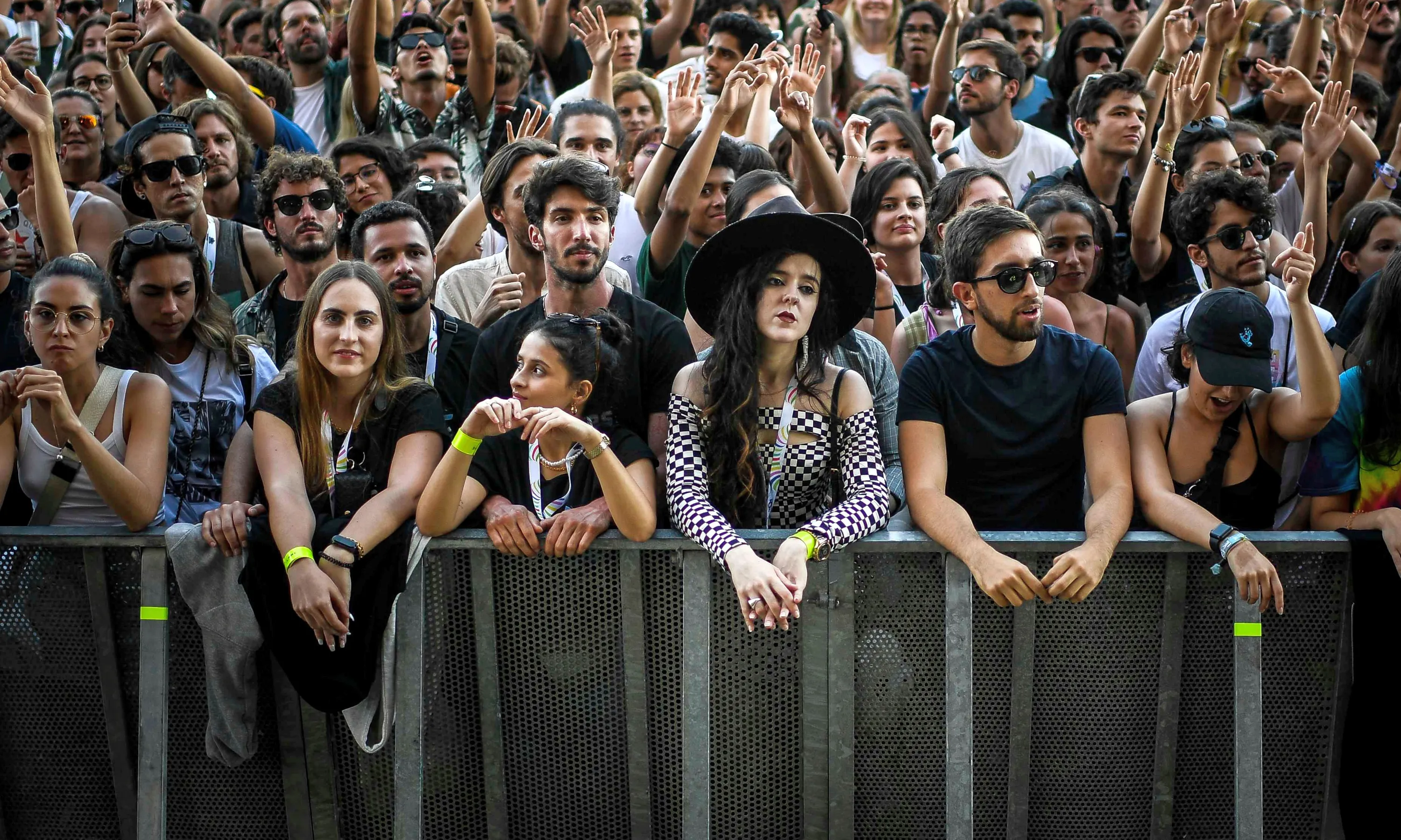 Festival attendees watch the British band Jungle performance during the first day of the 2022 Alive Festival in Oeiras in the outskirts of Lisbon on July 6, 2022. (Photo by Patrícia de Melo Moreira/AFP Photo)