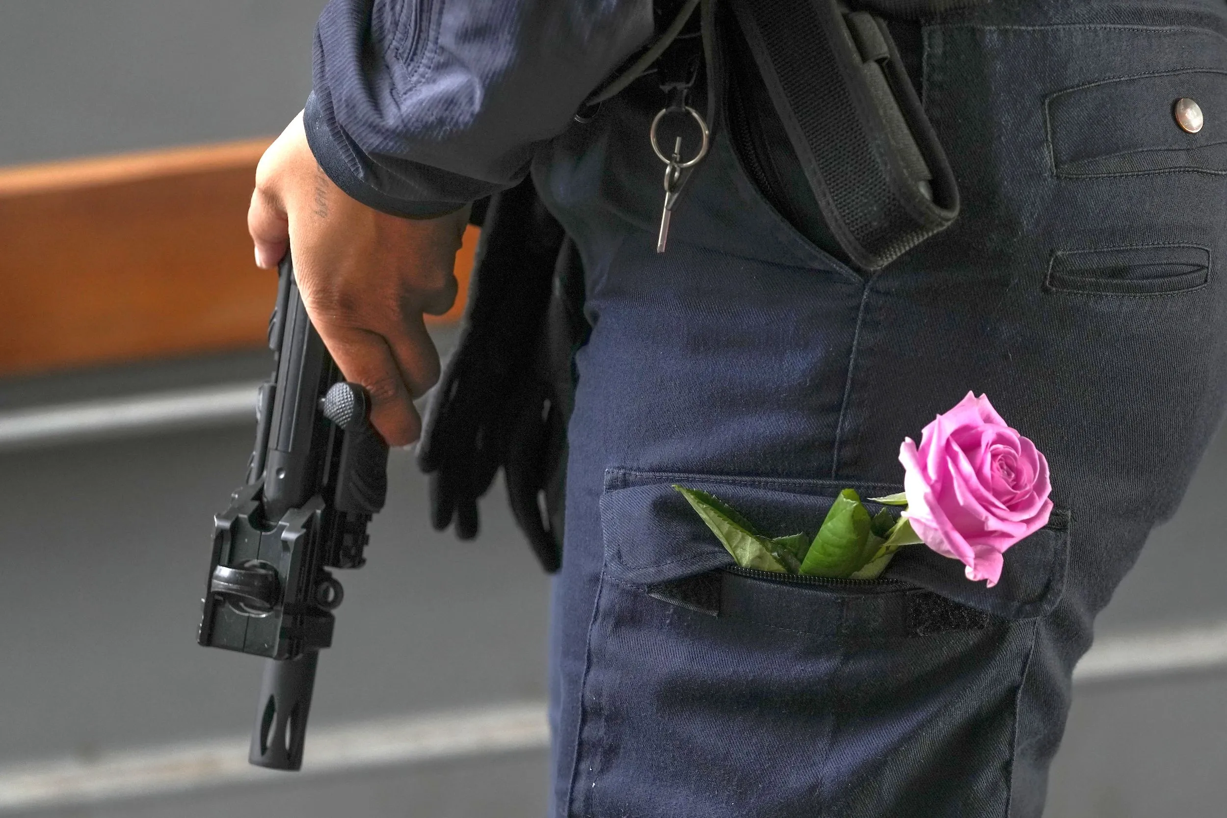 A police officer stands guard with a flower in his pocket as people gather to remember victims at the entrance of the Field's shopping center in Copenhagen, Denmark, Tuesday, July 5, 2022. Police say a gunman who killed three people when he opened fire in a crowded shopping mall acted alone and apparently selected his victims at random. They all but ruled out that Sunday's attack was related to terrorism. Authorities on Monday filed preliminary charges of murder and attempted murder against a 22-year-old Danish man. (Photo by Sergei Grits/AP Photo)