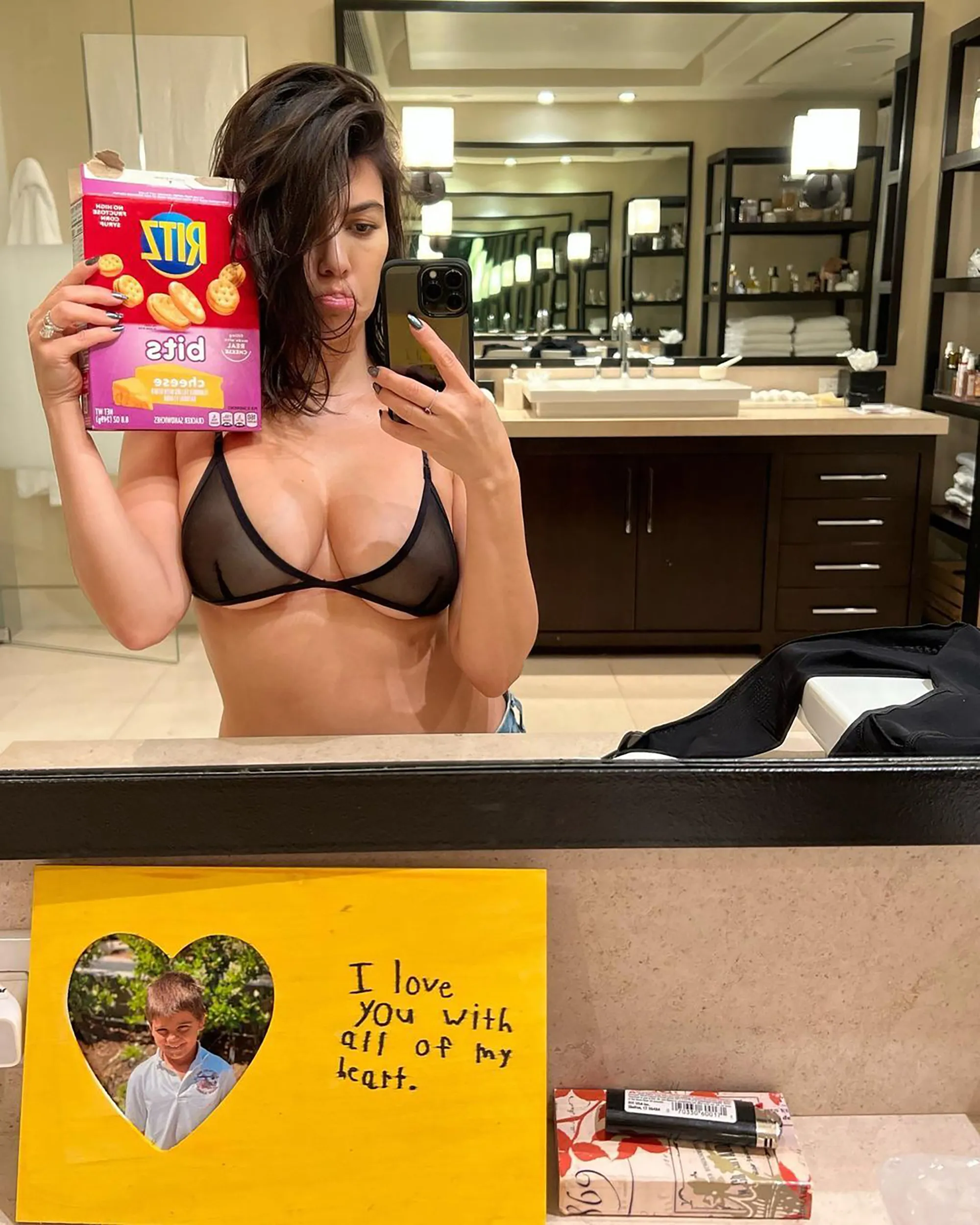 American media personality Kourtney Kardashian shares a sweet note from her son Reign while standing in her bra with a box of Ritz Bits in the first decade of July 2022. (Photo by kourtneykardash/Instagram)