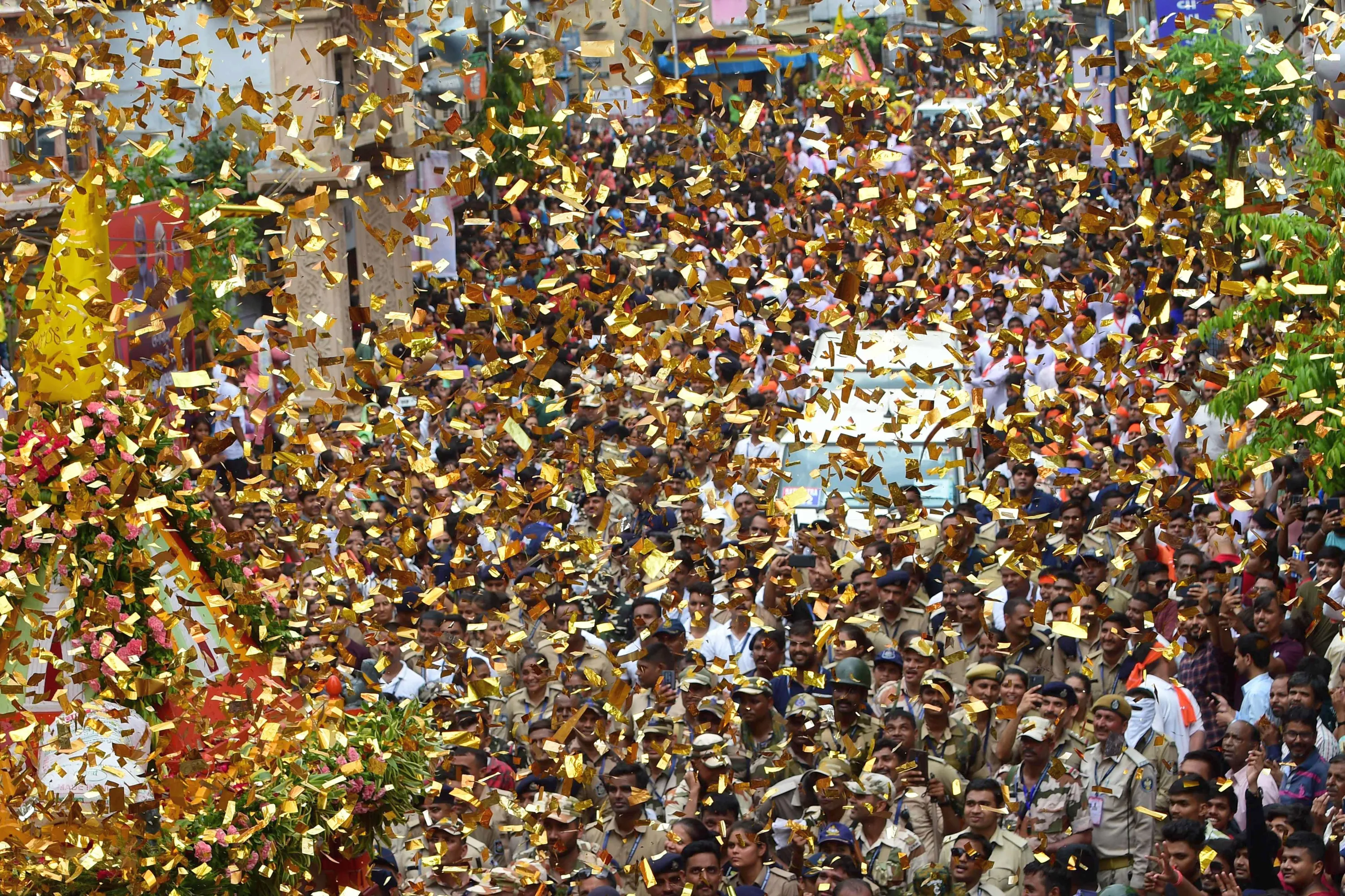Police personnel march amid confetti during the 145th Rath Yatra of Lord Jagannath religious procession in Ahmedabad on July 1, 2022. (Photo by Sam Panthaky/AFP Photo)